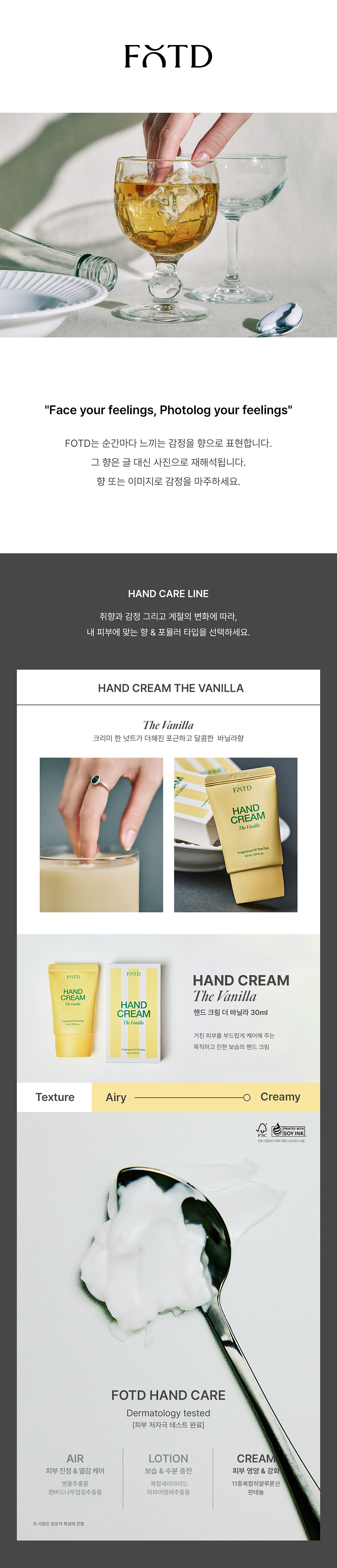에프오티디(FOTD)는 'Fragrance of the day'의 축약어로 '오늘의 향'이라는 뜻을 담은 라이프 스타일 프래그런스 브랜드입니다. 그날의 감정을 향으로, 그 향을 사진으로 디자인하여 제품을 표현합니다.