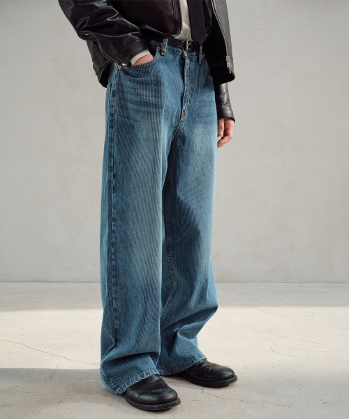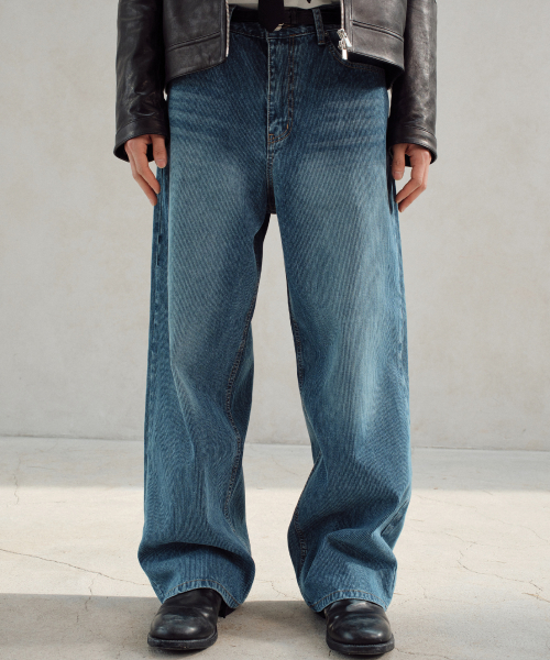 WIDE CURVED DENIM PANTS (WASHED DARK BLUE)