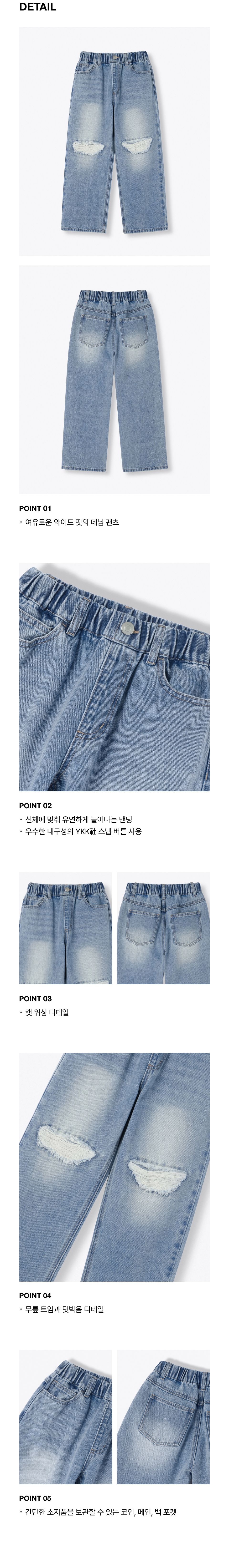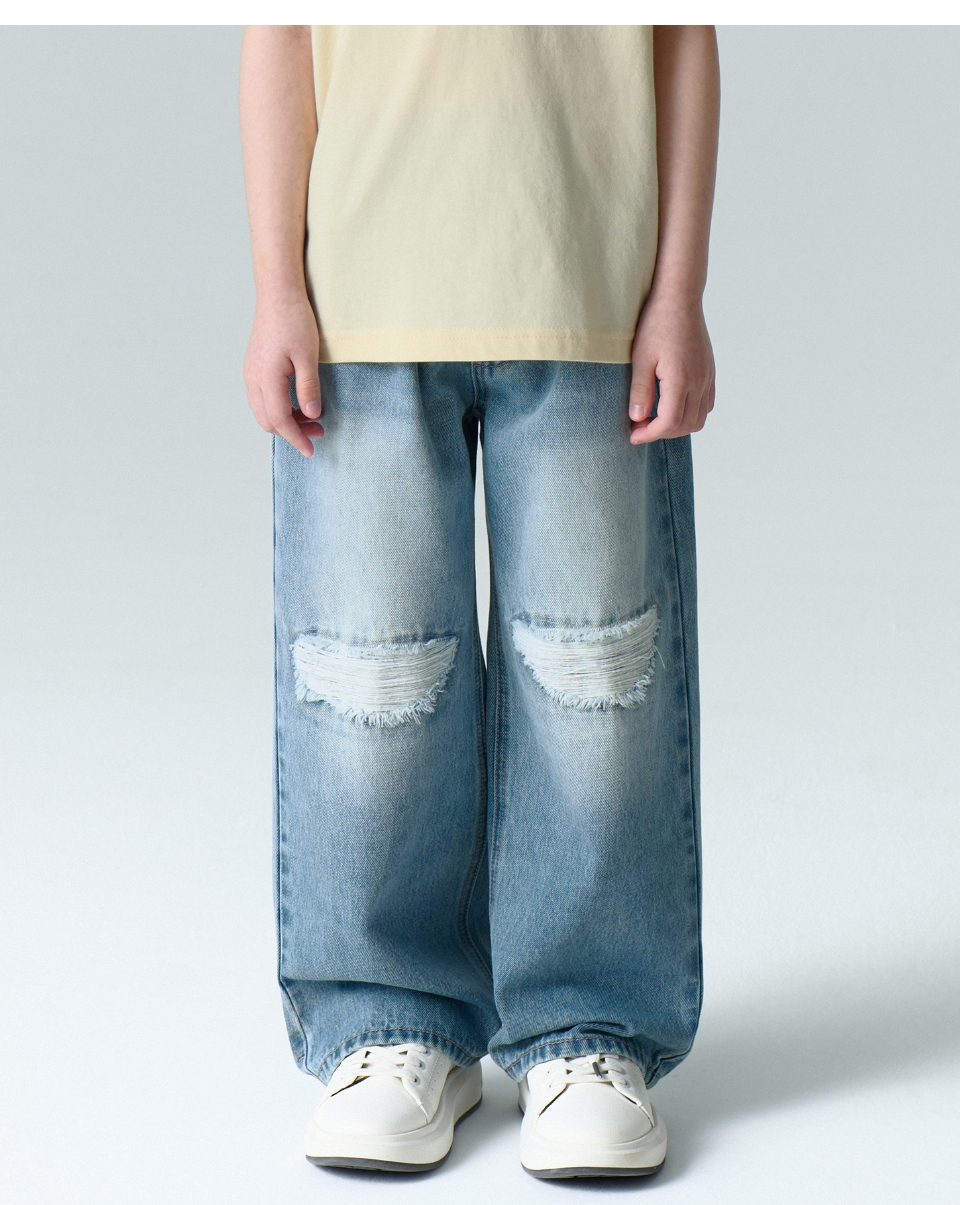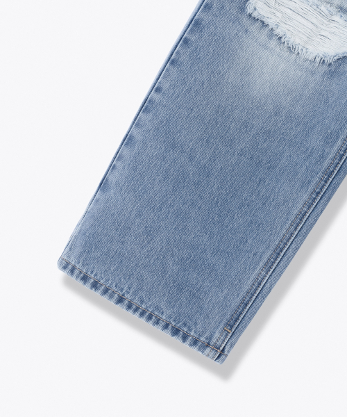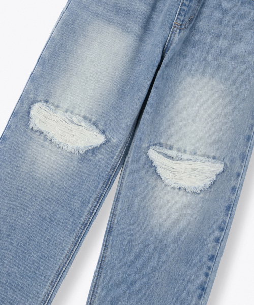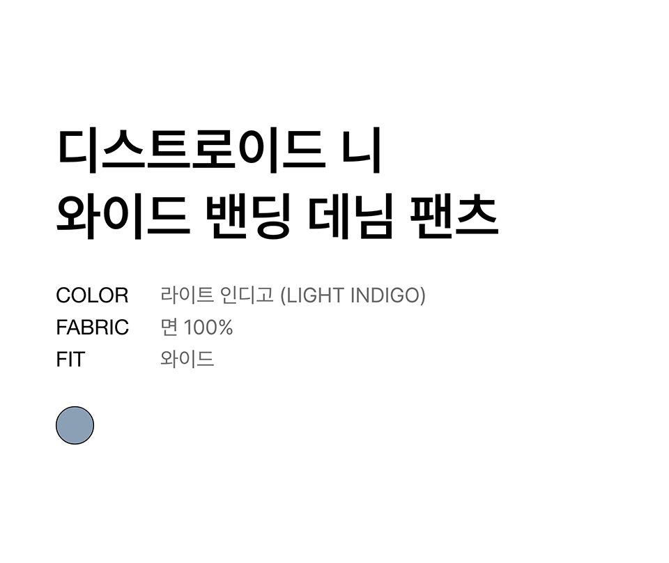 디스트로이드 니 와이드 밴딩 데님 팬츠 [라이트 인디고]
