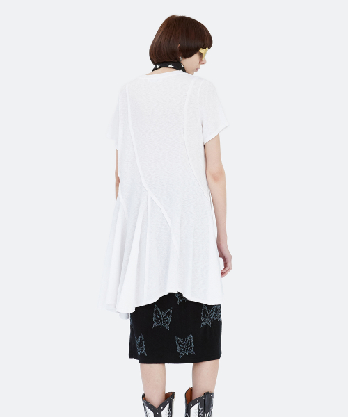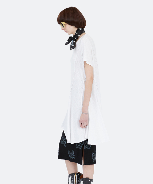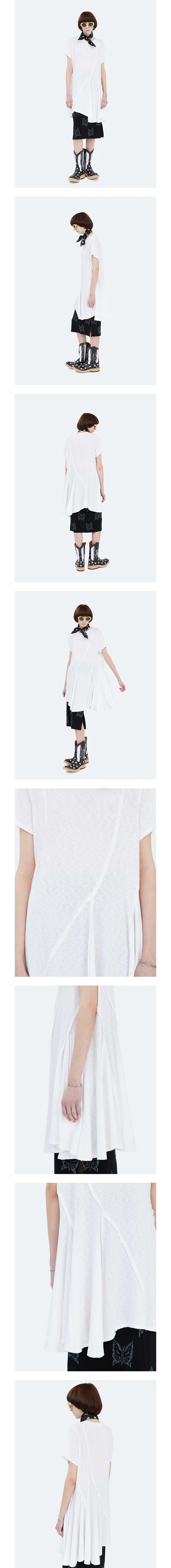 절개 및 마감을 커팅하여 러프한 무드를 연출하였으며 불규칙하게 떨어지는 실루엣으로 유니크함을 주었습니다.