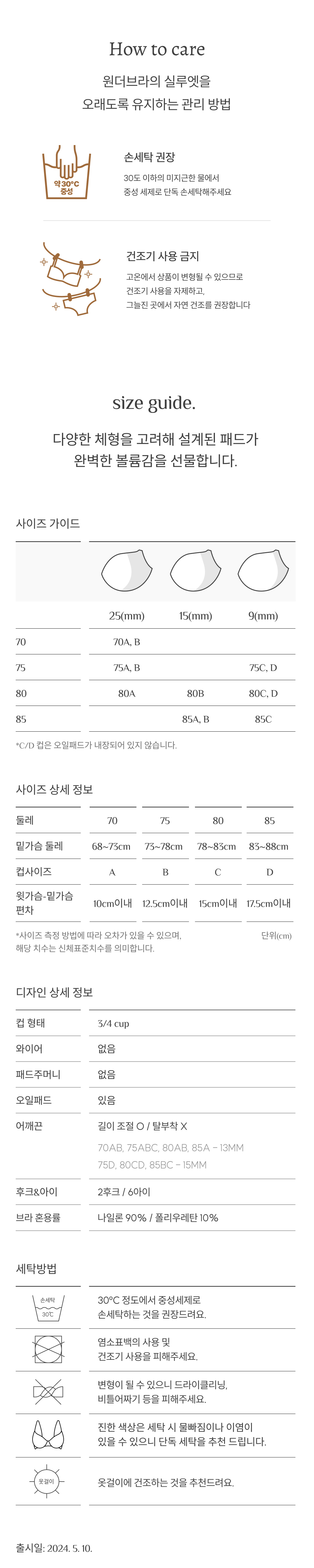 원더브라(WONDERBRA)는 1935년 시작됐습니다. 오랜 기술력에 현대적인 감각을 더해 완벽한 볼륨감으로 완성되는 원더브라는, 모든 여성에게 가장 이상적인 실루엣을 선물하는 브랜드입니다.