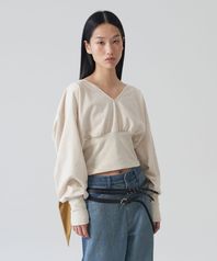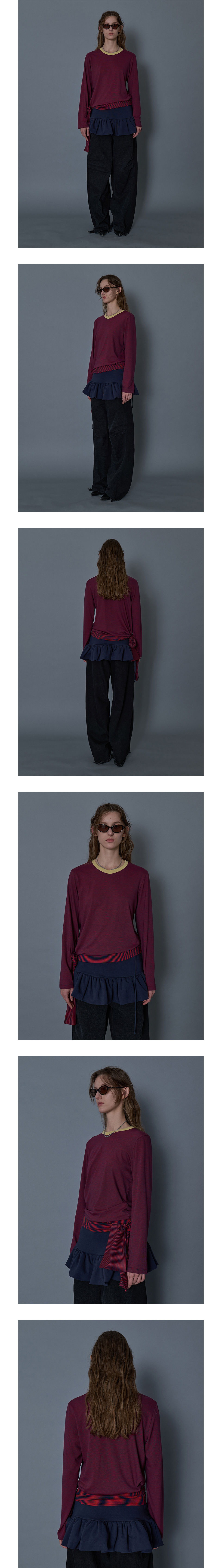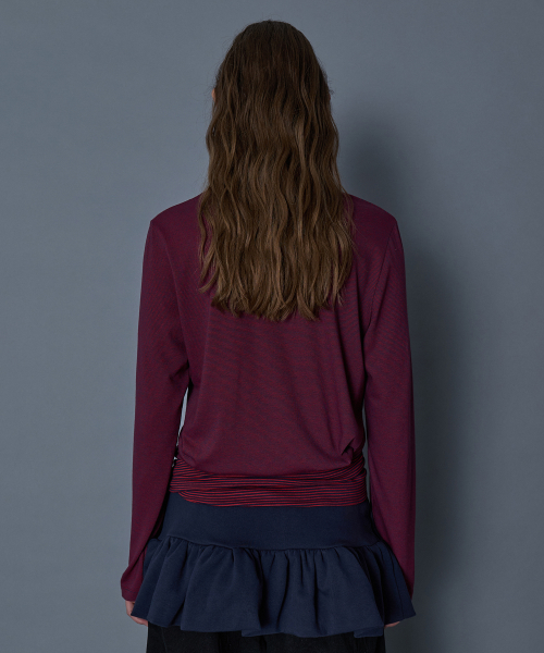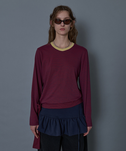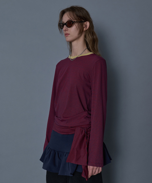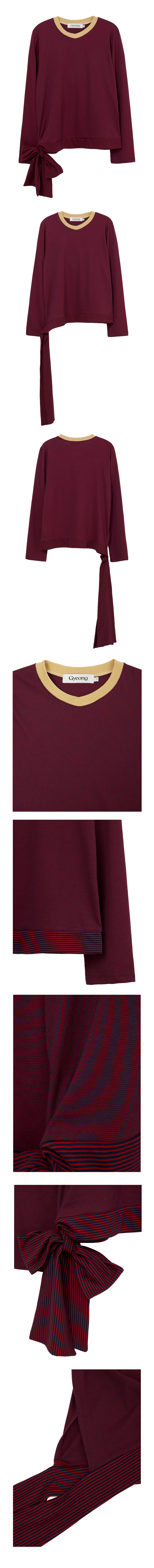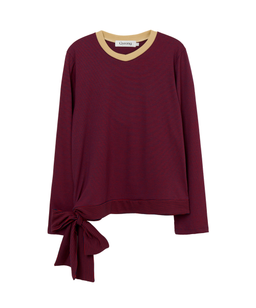 - 밑단 배색 스트라이프의 타이 디테일의 롱 슬리브 탑