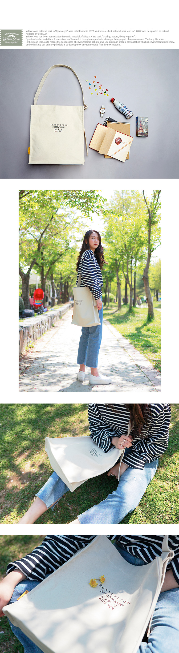 YELLOWSTONE(옐로우스톤)은 1892년, 미국 최초 국립공언으로 지정, 1978년 유네스코 자연유산으로 지정된 와이오밍 주에 속한 Yellowstone의 명칭으로부터 명명되었스며, '위대한 자연과 인간의 공존'이라는 의미를 부여한 , 'Sharing Nature, Living Together'라는 슬로건 아래, '네이처,어드벤처,빈티지;라는 테마와 함께 'Ordinary Life Style'을 지향합니다. 그리고 동시에 자연 환경 보존, 환경 오염에 심각성을 널리 알리고 개선하는데 동참하고자 친환경 최상금 Organic Canvas Fabric 중심으로 가급적 자연에 유해되지 않는 소재를 개발 및 사용하여 가방을 생산하고 있으며, 현재에도 그리고 앞으로도 늘 신소재 개발에 주안을 둘 것입니다.
