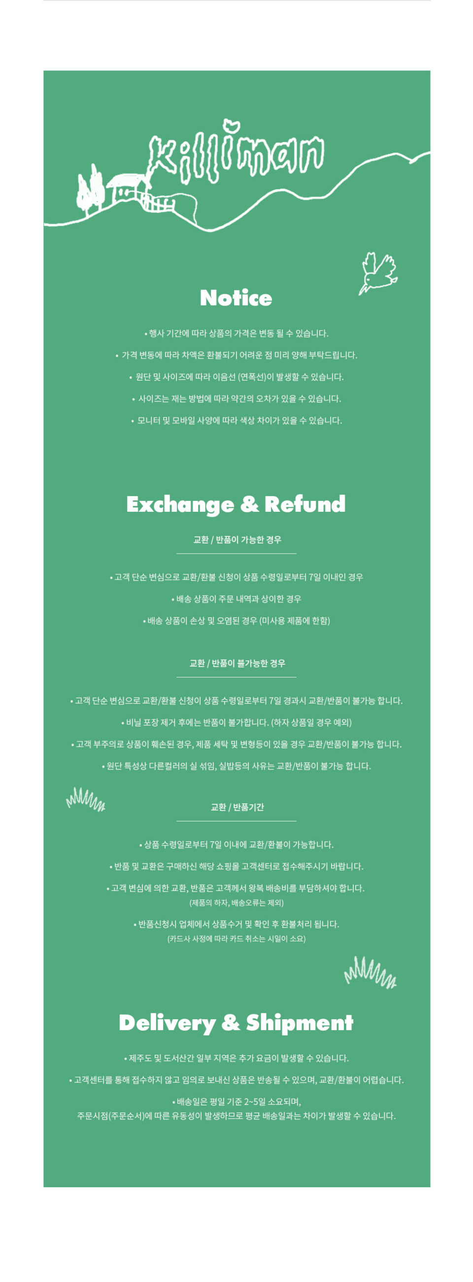 킬리만(KILLIMAN)은 더운 아프리카의 차가운 만년설처럼 지친 일상 속 쾌청한 순간과 신선한 일상을 위한 아이템을 선보이는 브랜드입니다.