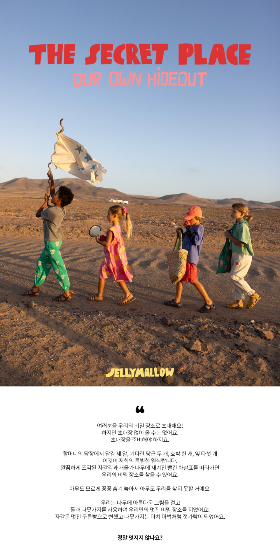 젤리멜로(JELLYMALLOW)는 흥미로운 디테일과 유니크, 위트 있는 디자인으로 아이들에게 편안함과 행복함을 가져다주는 브랜드입니다. 젤리멜로는 전 세계 어린이들의 풍부함 과 무수한 상상력으로 성장하고 있습니다. 앞으로도 우리는 아이들의 기쁨과 창의성, 특별한 영감을 다른 아이들과의 공유할 수 있기를 기대합니다. 우리는 단지 패션을 넘어 매 순간 당신의 작은 햇살과 같은 특별한 순간의 일부가 될 것입니다.