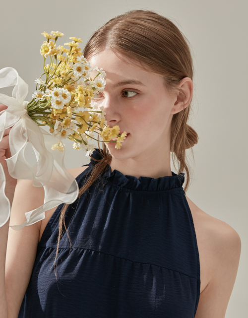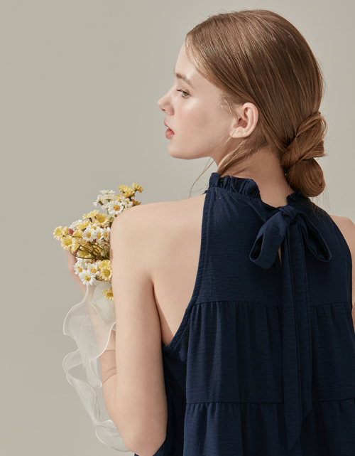 · 잉크네이비 컬러의 감각적인 홀터 미니 원피스