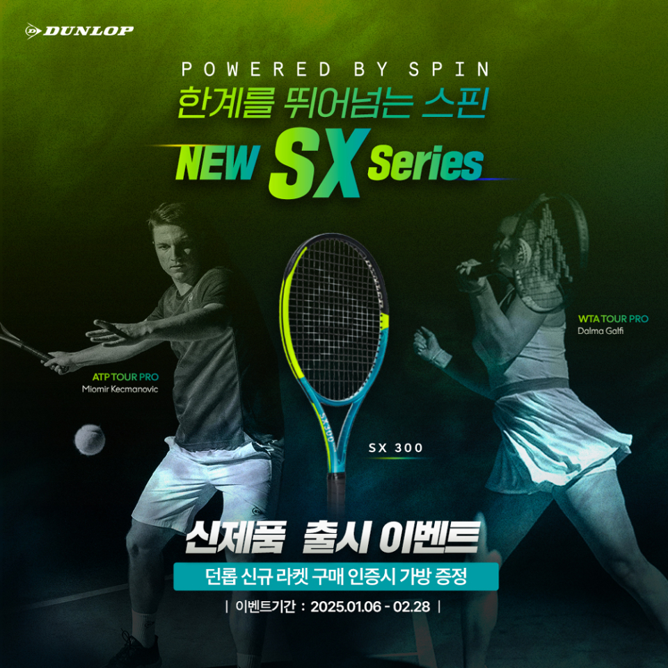 던롭 라켓(DUNLOP RACKET)은 100년의 역사와 전통을 자랑하는 브랜드입니다. 던롭 라켓의 테니스공은 ATP 투어와 호주 오픈의 공식구로 지정되었습니다. 스쿼시는 프로 스쿼시 협회(PSA, Professional Squash Association) 공식 파트너사로 남녀 투어 대회와 공식 테니스용품을 적극 지원합니다. 스포츠를 즐기고 사랑하는 플레이어를 위해 'LOVE THE GAME'이라는 메시지를 전 세계에 알리고 있습니다.
