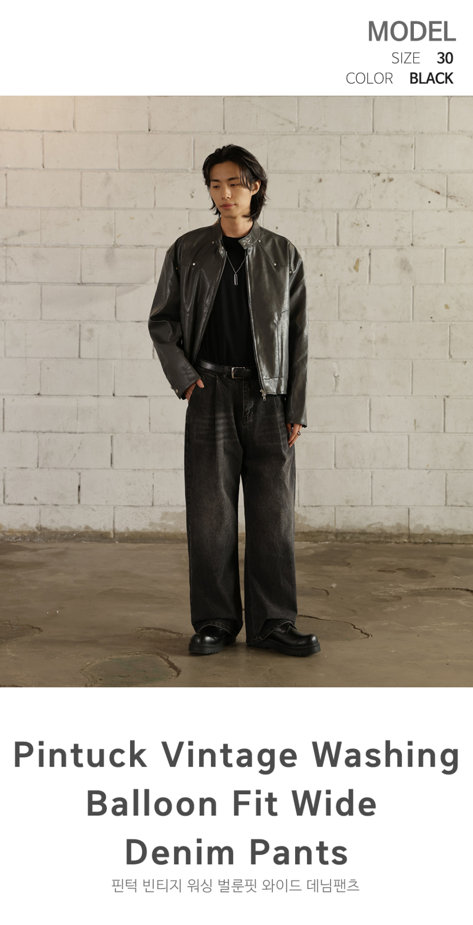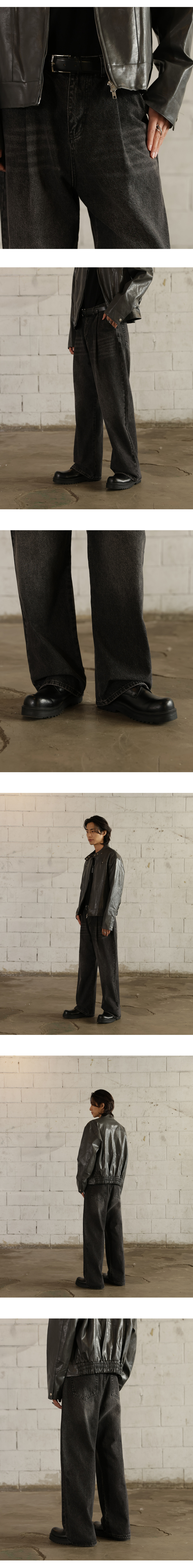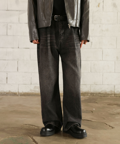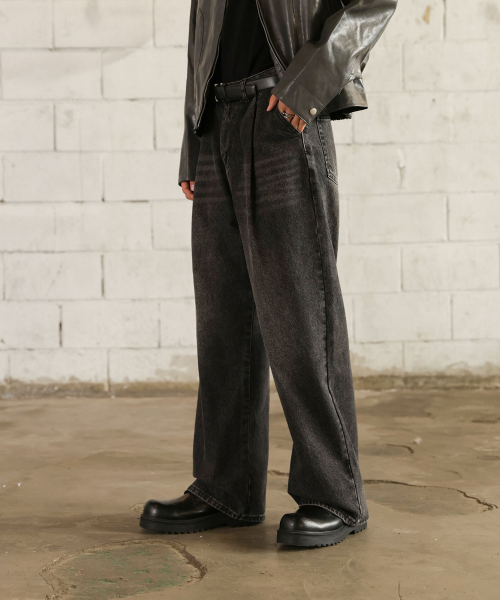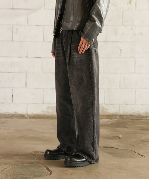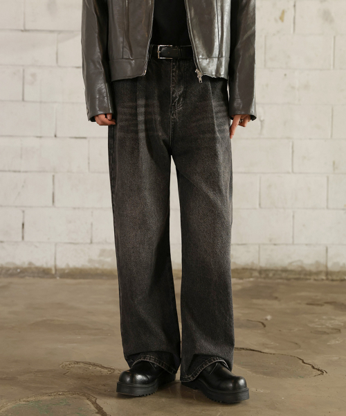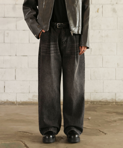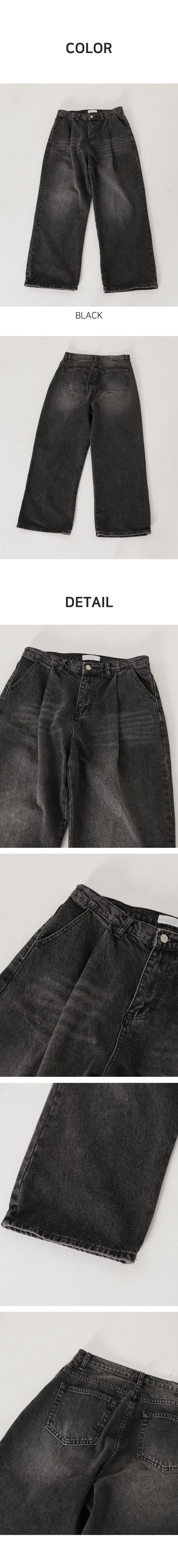 핀턱 빈티지 워싱 벌룬핏 와이드 데님팬츠(Black)