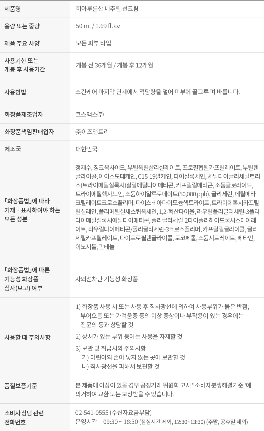 히아루론산 네추럴 선크림 50ml