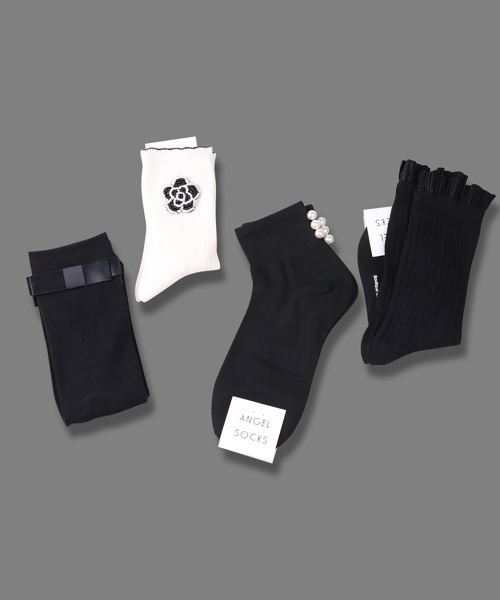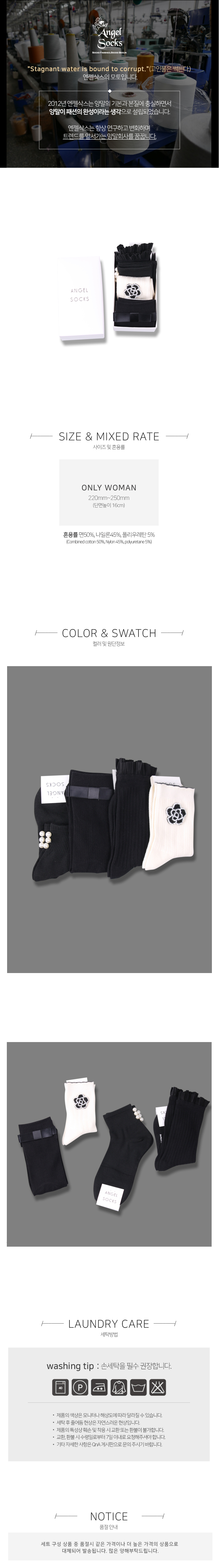 ANGEL SOCKS(엔젤삭스)는 디자이너가 직접 제작, 생산, 초이스 하는 풋 웨어 전문 브랜드입니다. 직, HAND LINKED TOE 등의 고급 편직기술과 앙고라, 울, 슬러브사 등의 다양한 소재를 사용하여, 모던한 색상과 패턴의 상품부터 컬러풀하고 위트 넘치는 다양한 상품을 제작합니다.