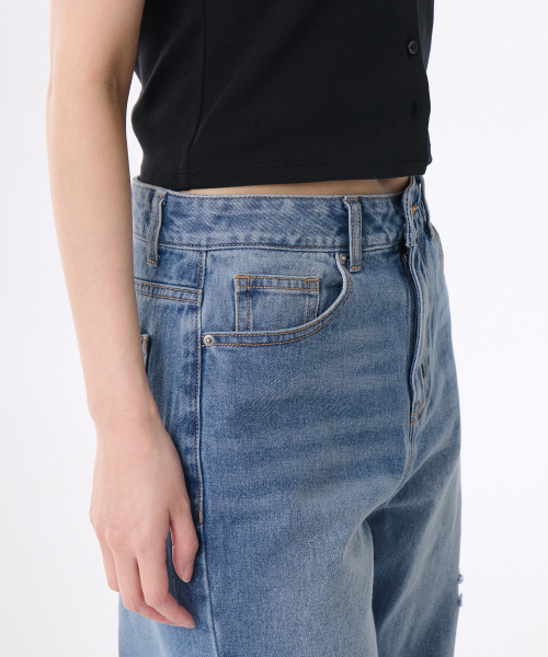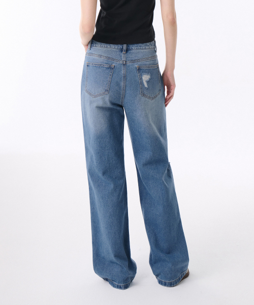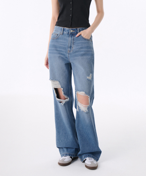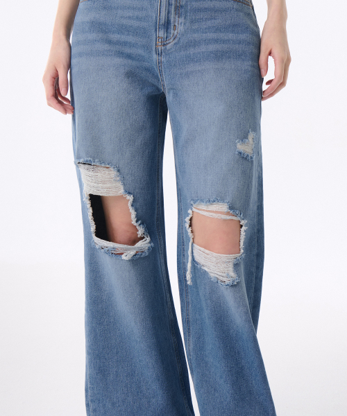 우먼즈 멀티 디스트로이드 와이드 데님 팬츠 [라이트 인디고]