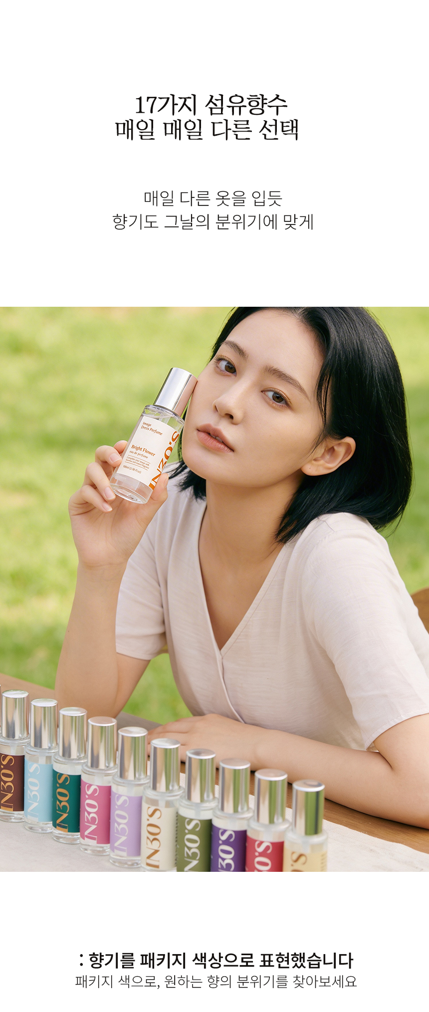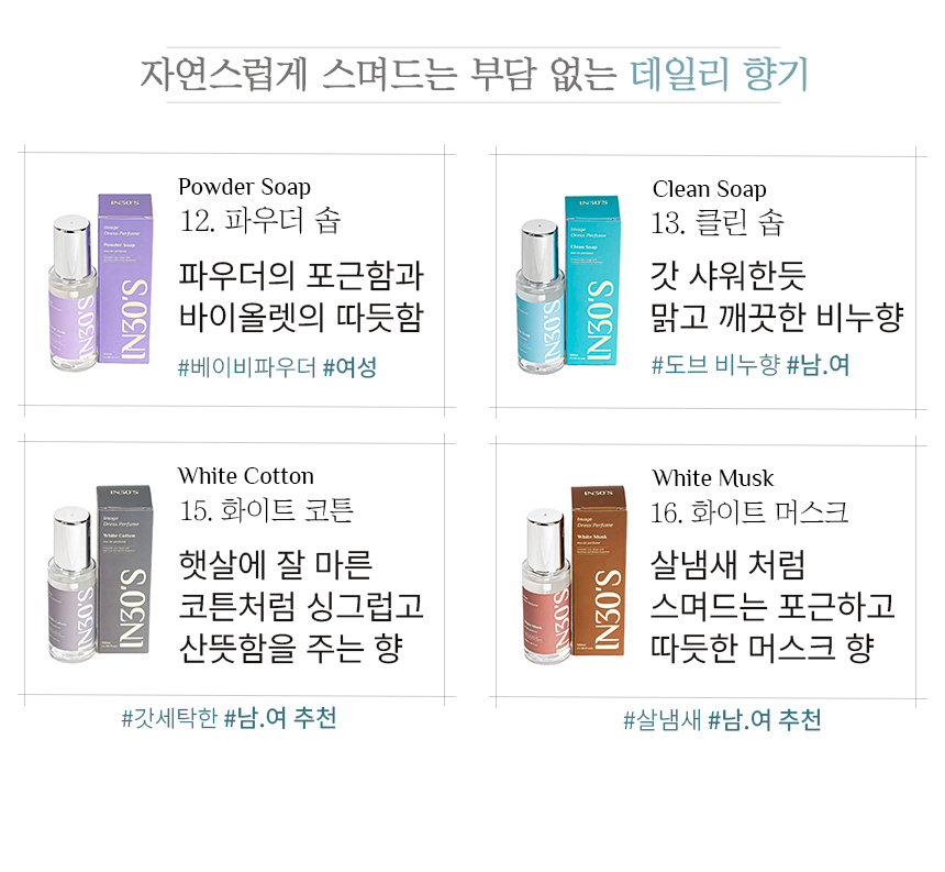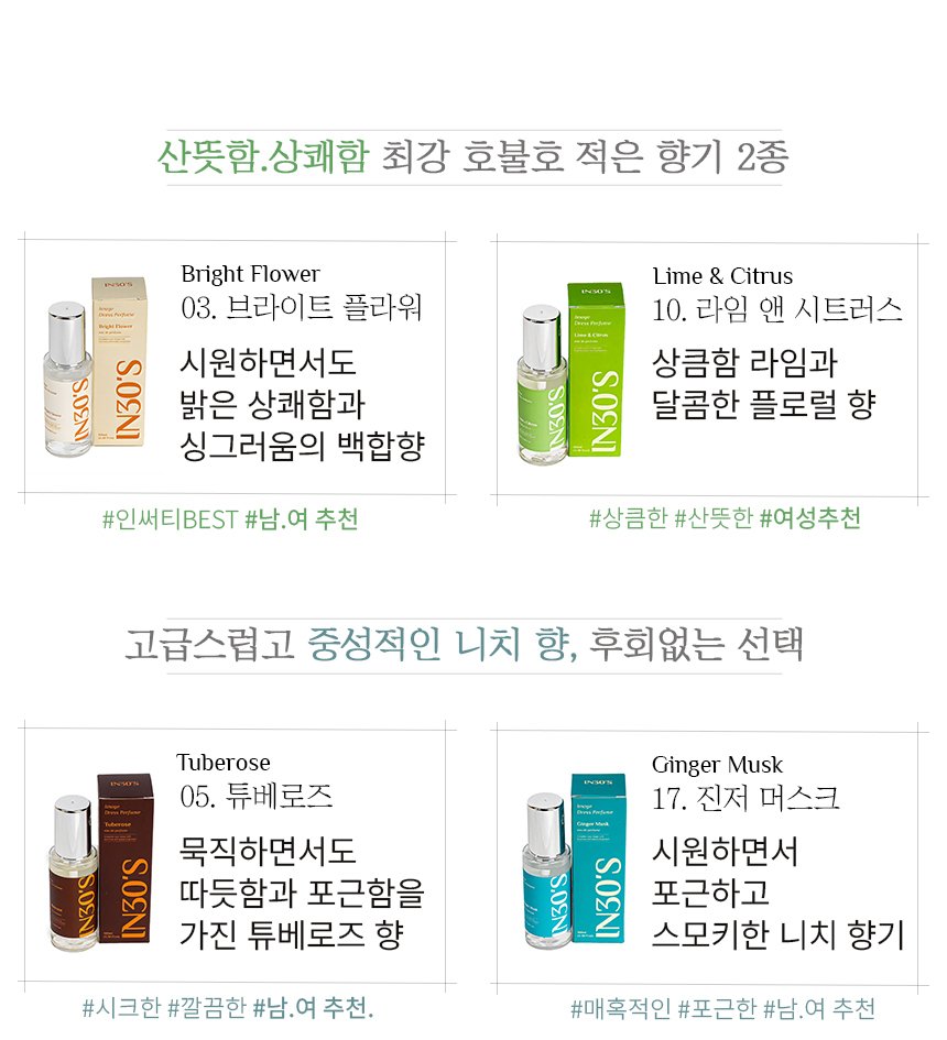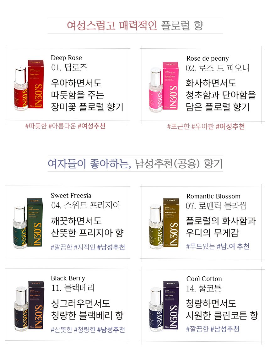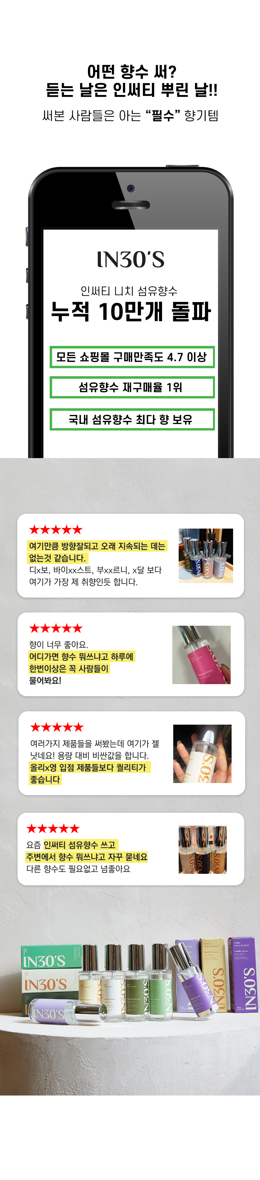 인써티(IN30'S)는 '30초 만에 완벽한 당신을 위해'라는 슬로건으로 바쁜 현대인들이 짧은 시간 안에 스스로를 케어할 수 있게 만드는 제품을 선보이는 브랜드입니다. 이미지 케어를 할 수 있는 섬유향수(드레스 퍼퓸), 단순히 좋은 향기를 넘어 힐링과 복을 선사하는 복주머니 디퓨저 등으로 일상의 향기와 행복을 전합니다.