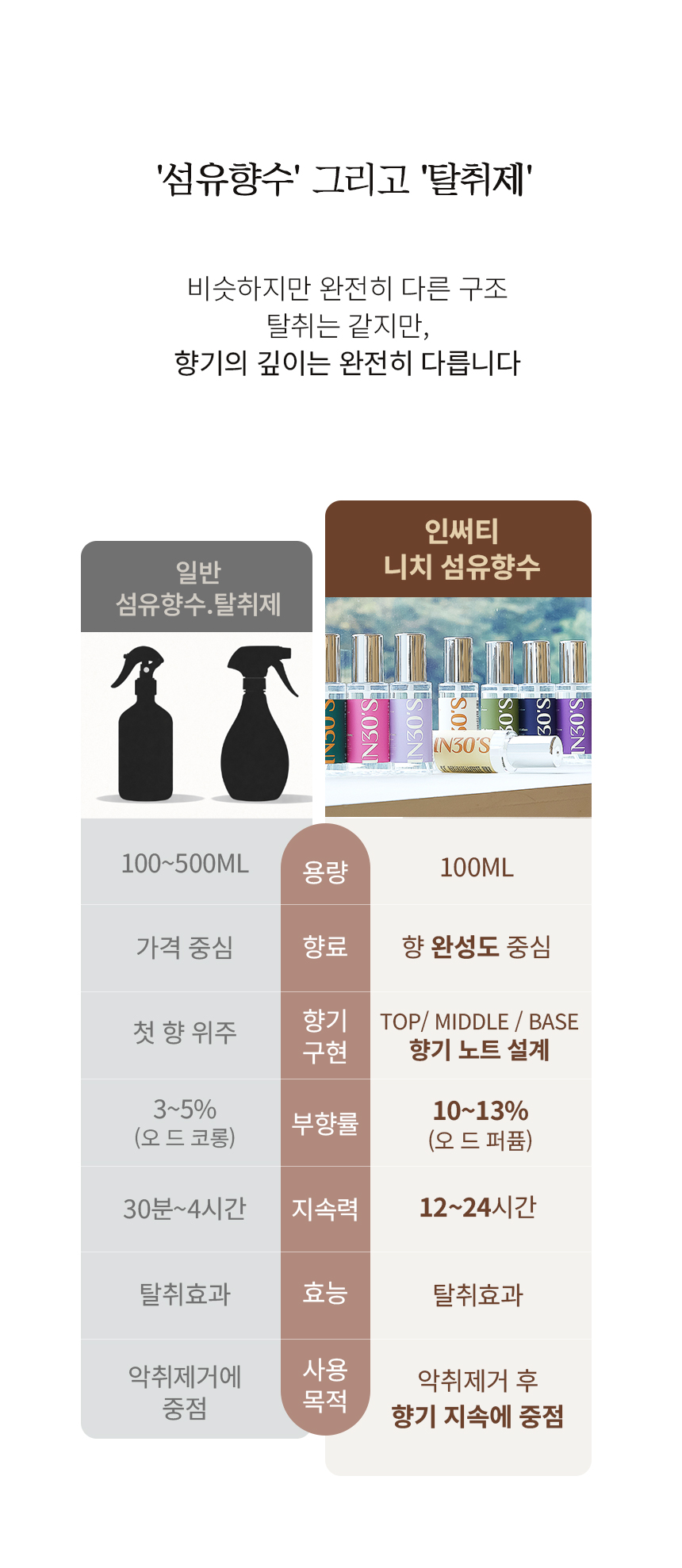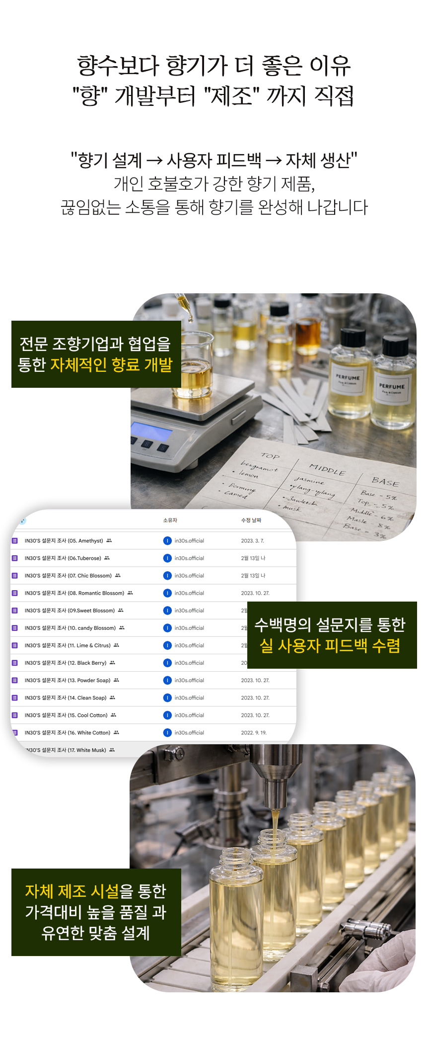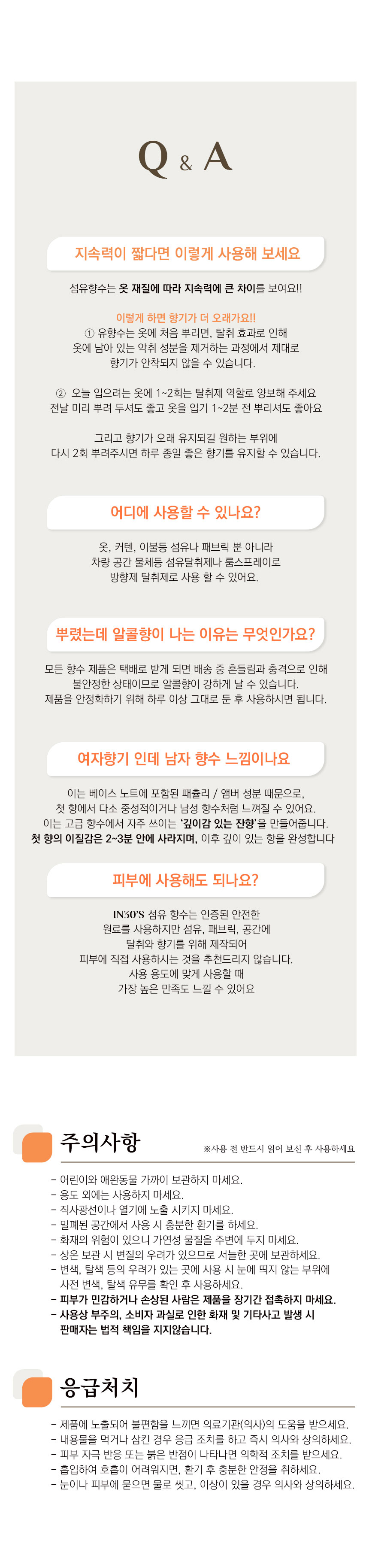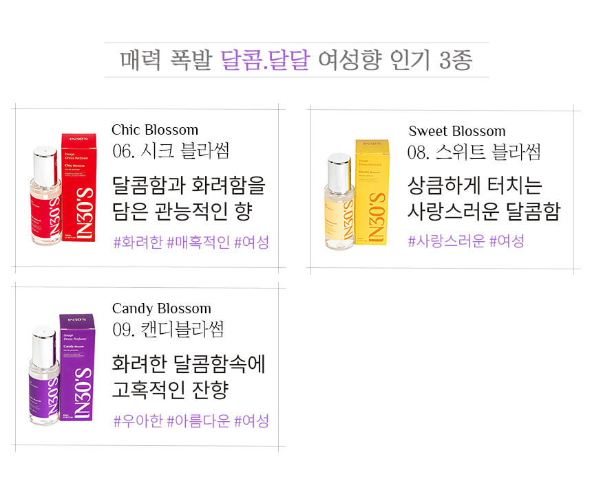 인써티(IN30'S)는 '30초 만에 완벽한 당신을 위해'라는 슬로건으로 바쁜 현대인들이 짧은 시간 안에 스스로를 케어할 수 있게 만드는 제품을 선보이는 브랜드입니다. 이미지 케어를 할 수 있는 섬유향수(드레스 퍼퓸), 단순히 좋은 향기를 넘어 힐링과 복을 선사하는 복주머니 디퓨저 등으로 일상의 향기와 행복을 전합니다.