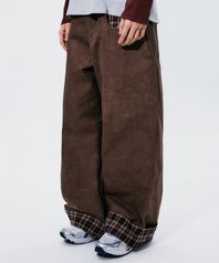 포인트 체크 포켓 배색 롤업 오버핏 와이드 코튼 팬츠 [브라운]