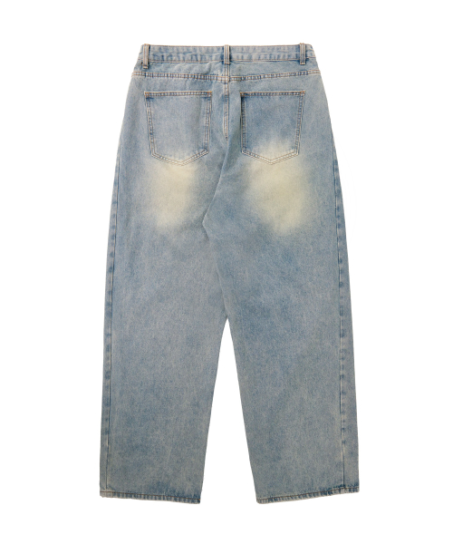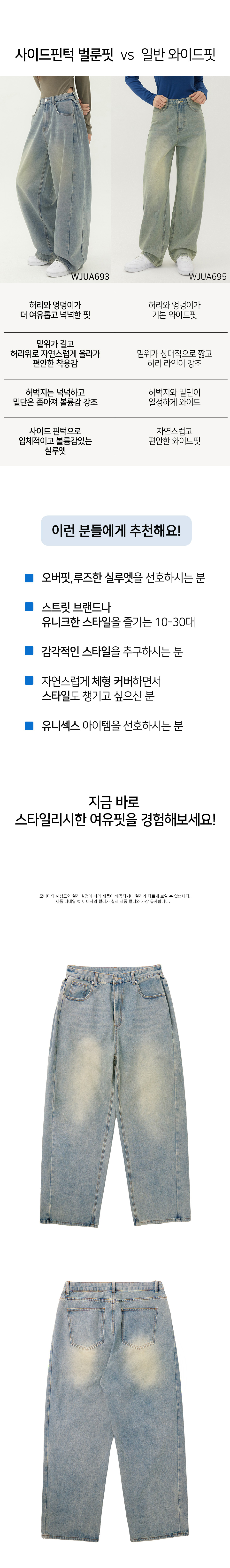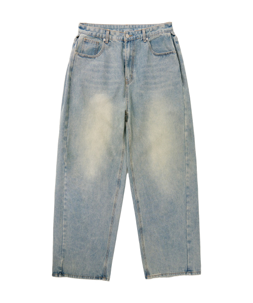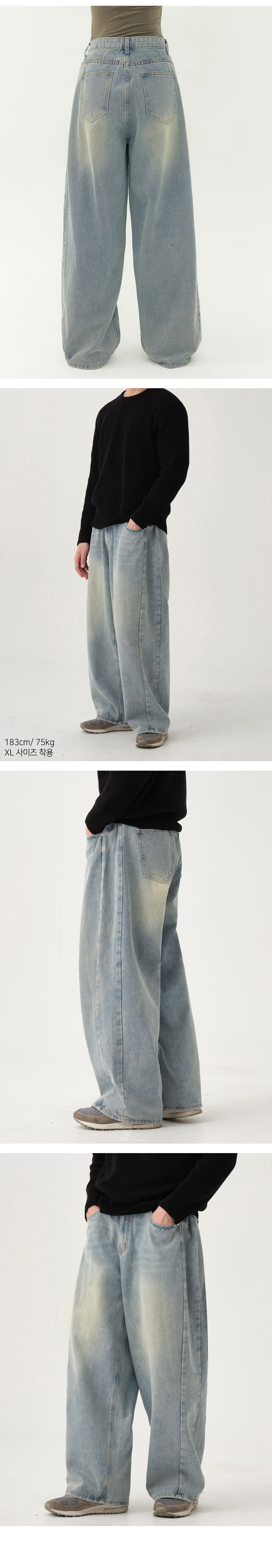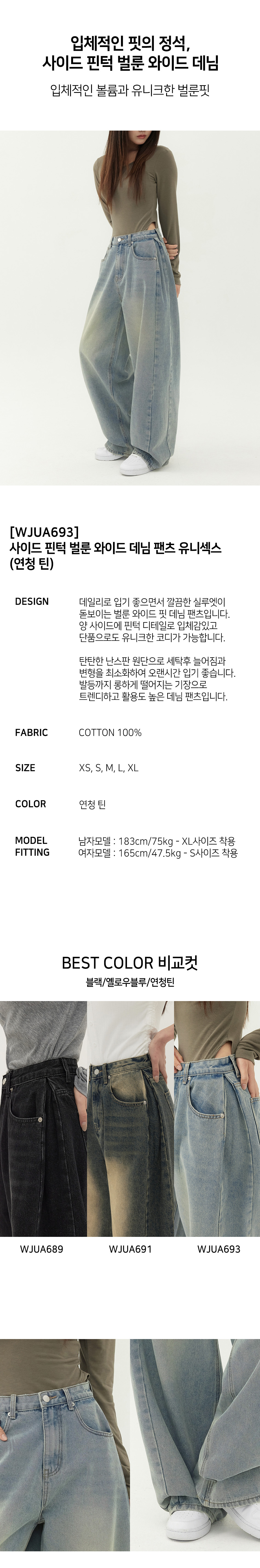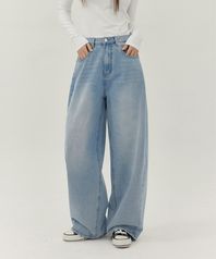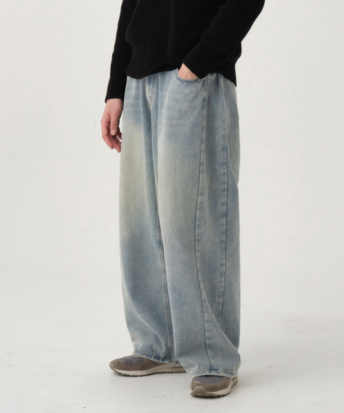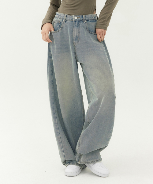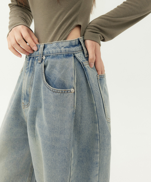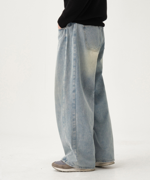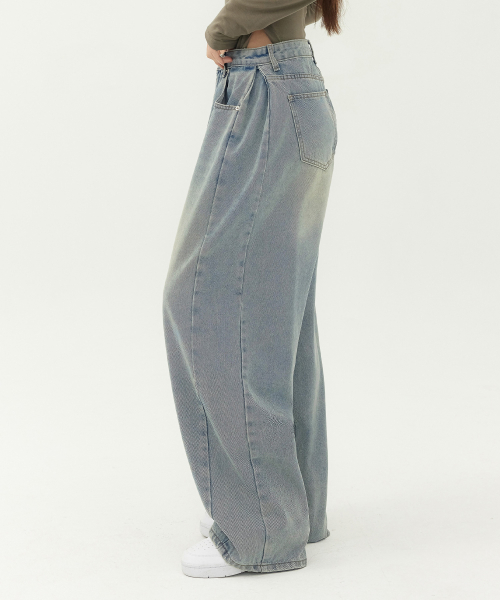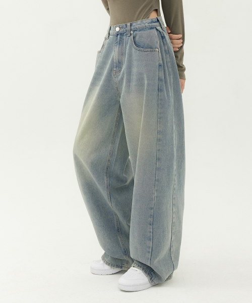 유니섹스 사이드 핀턱 벌룬 와이드 데님 팬츠 (연청 틴)