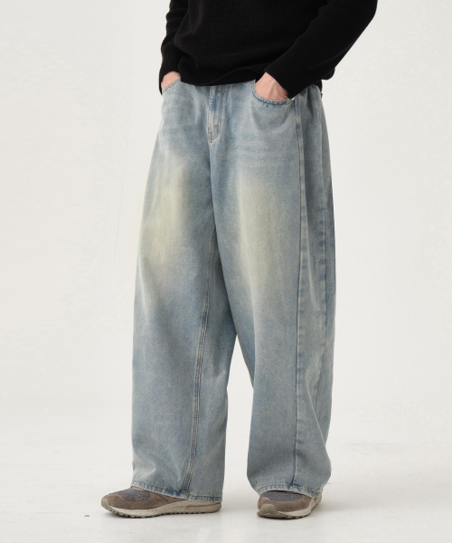 유니섹스 사이드 핀턱 벌룬 와이드 데님 팬츠 (옐로우블루)