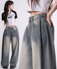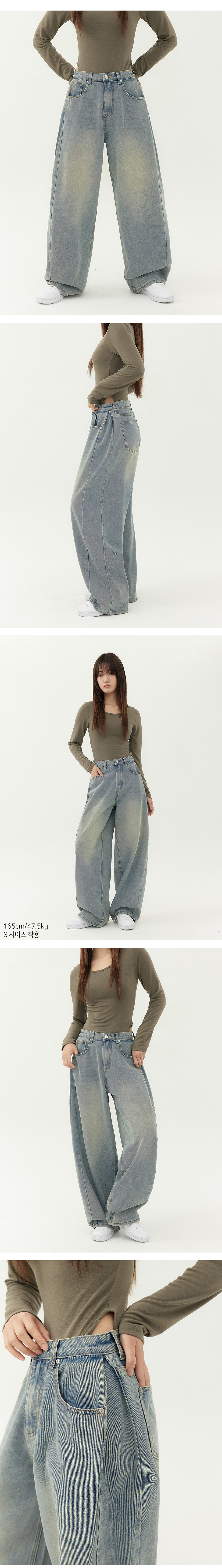 유니섹스 사이드 핀턱 벌룬 와이드 데님 팬츠 (그레이워싱)