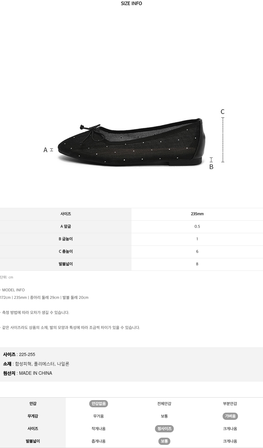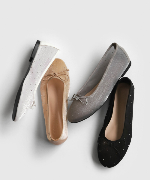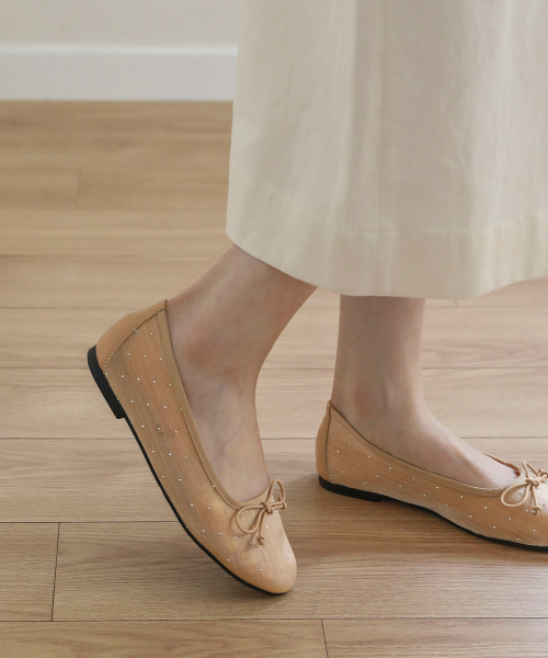 라운드토 쉐입에 유연하고 시원한 메쉬 소재가 가진 장점만을 그대로 살린 리본 플랫슈즈입니다. 투 톤의 은은한 광택감이 도는 펄 메쉬 소재 위에 작은 큐빅이 박혀 베이직한 룩에도 충분히 특별한 포인트 아이템이 되어줄 것입니다. 메쉬의 소프트한 소재감에 1cm의 플랫 한 굽 높이를 적용해 오랜 착화에도 가볍고 편안한 착용감을 유지할 수 있습니다.