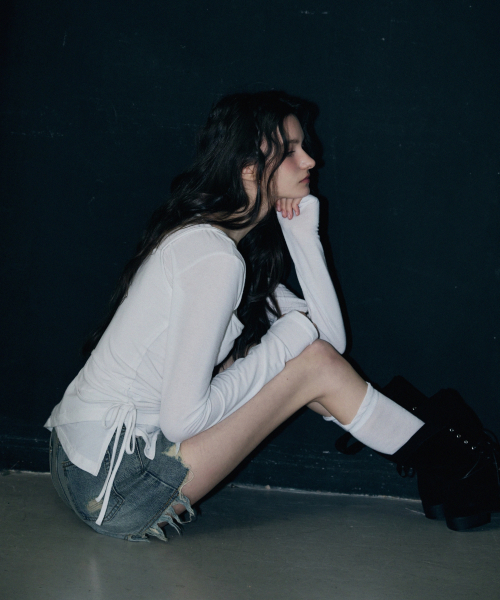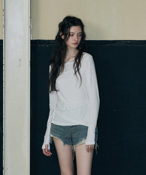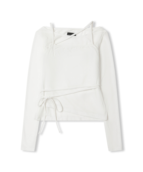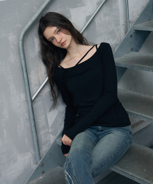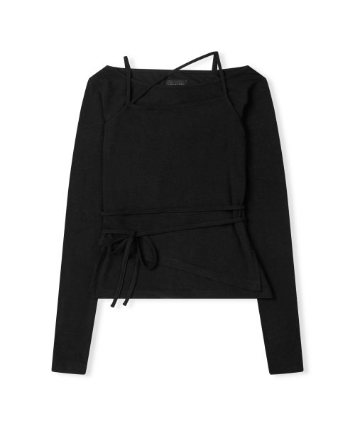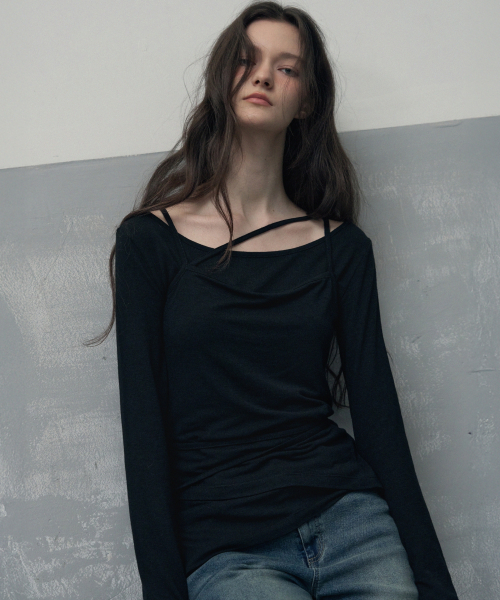 사이드 셔링 프릴 나시 레이어드 슬림핏 롱 슬리브리스 [블랙]