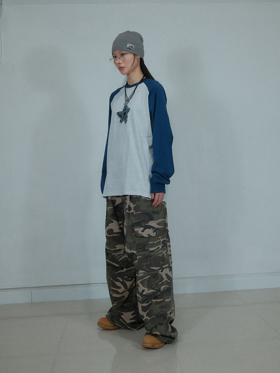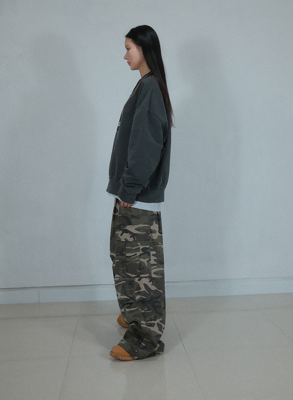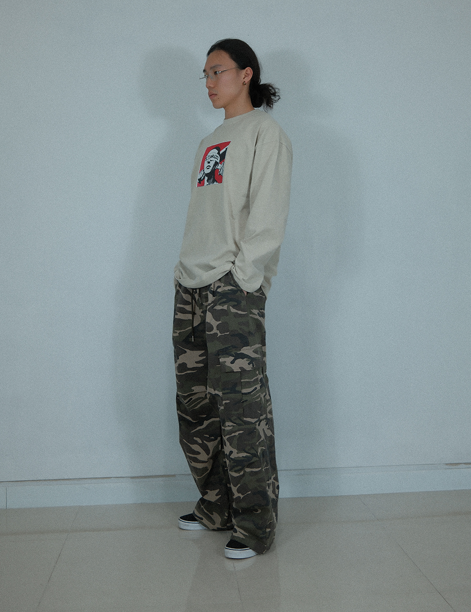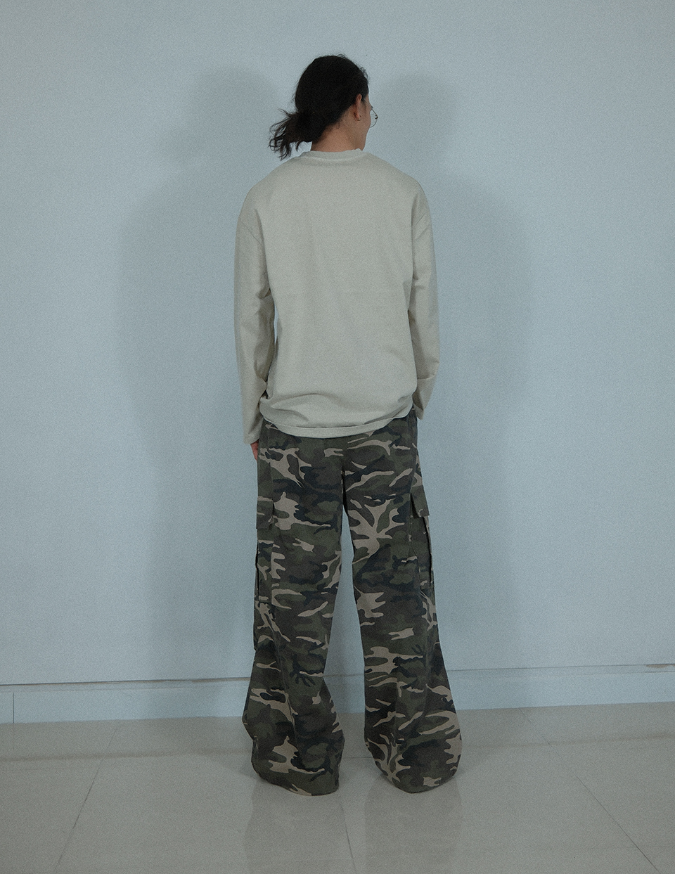 Camouflage Cotton Cargo Wide Pants ((Beige))
