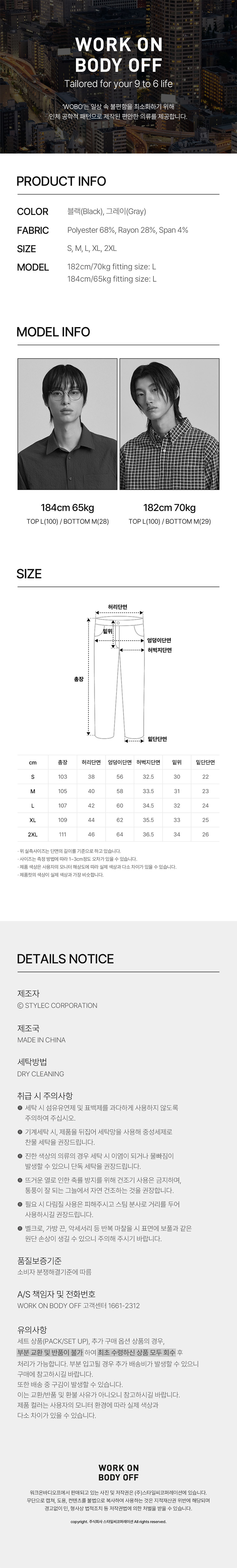 워크온바디오프(WORK ON BODY OFF)는 일상 속 불편함을 최소화 시키고자 탄생한 '오피스 워크 웨어' 브랜드입니다.