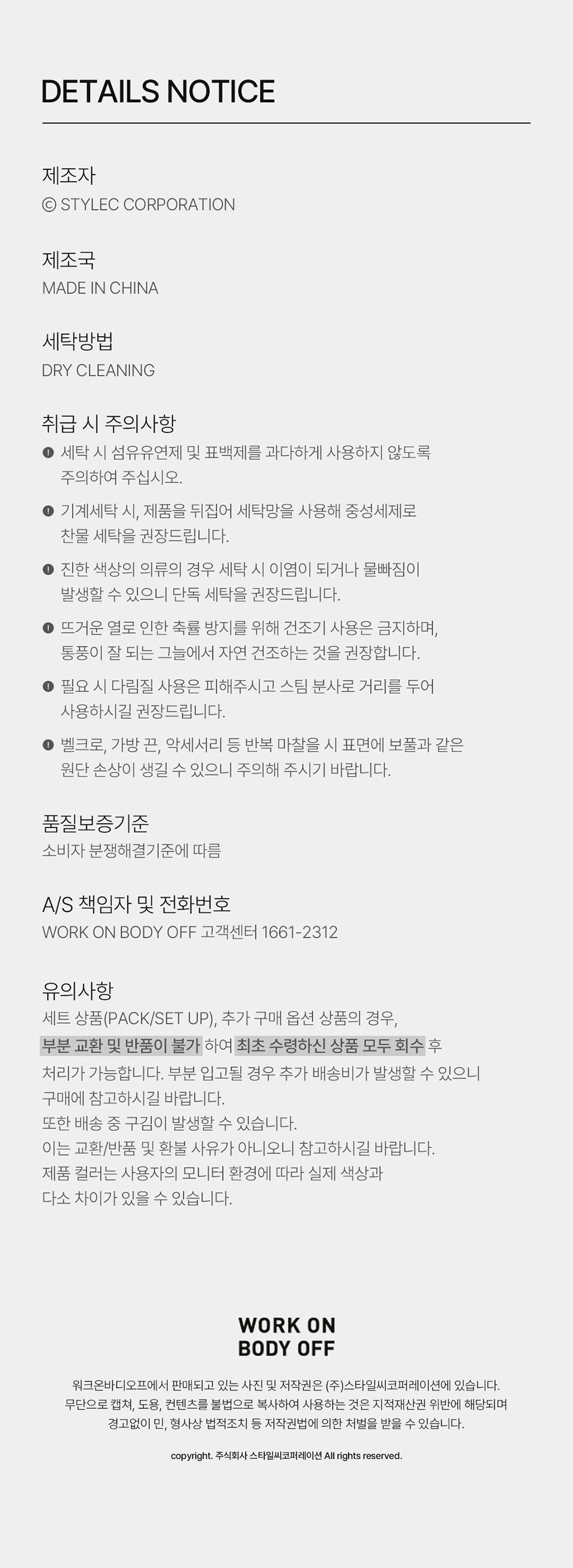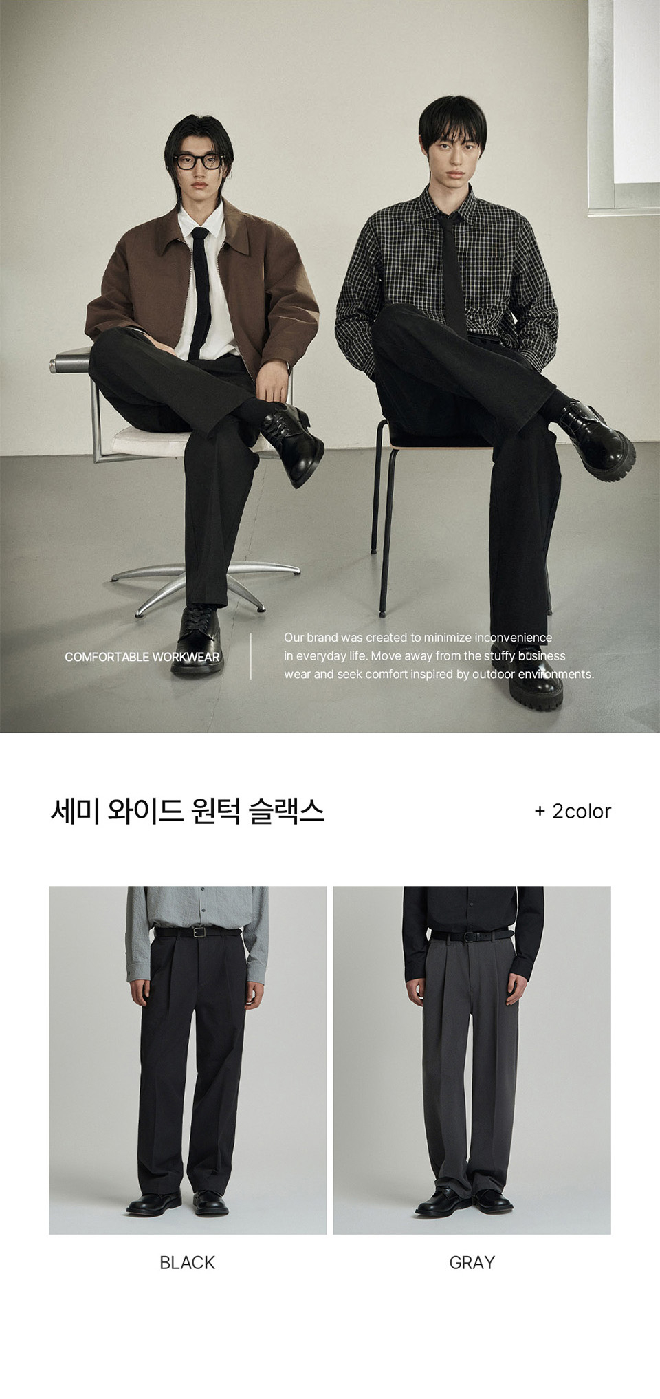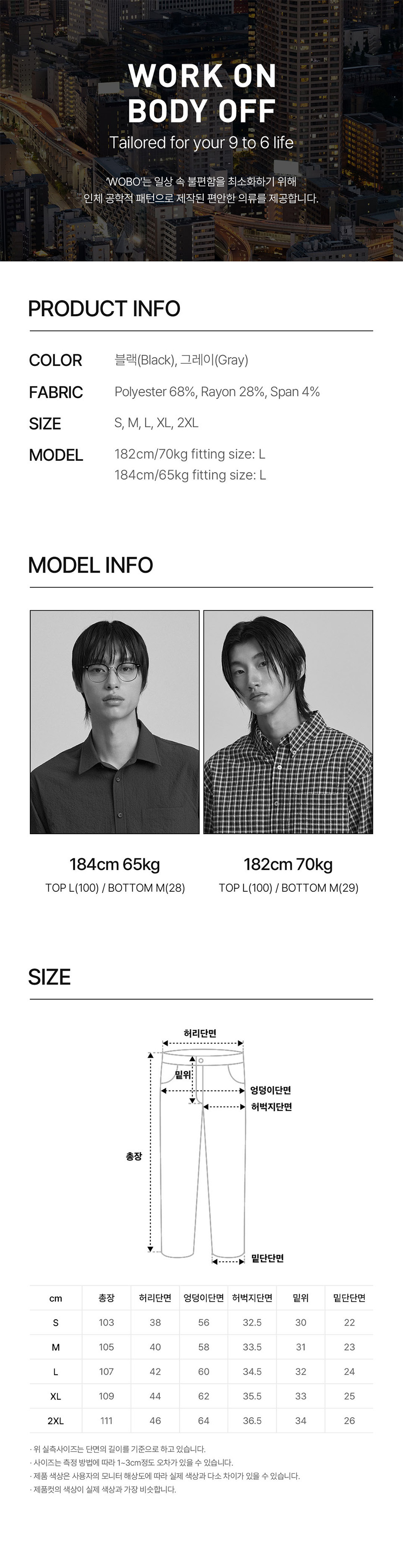 워크온바디오프(WORK ON BODY OFF)는 일상 속 불편함을 최소화 시키고자 탄생한 '오피스 워크 웨어' 브랜드입니다.