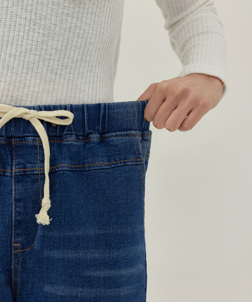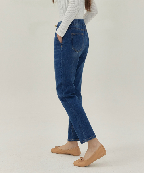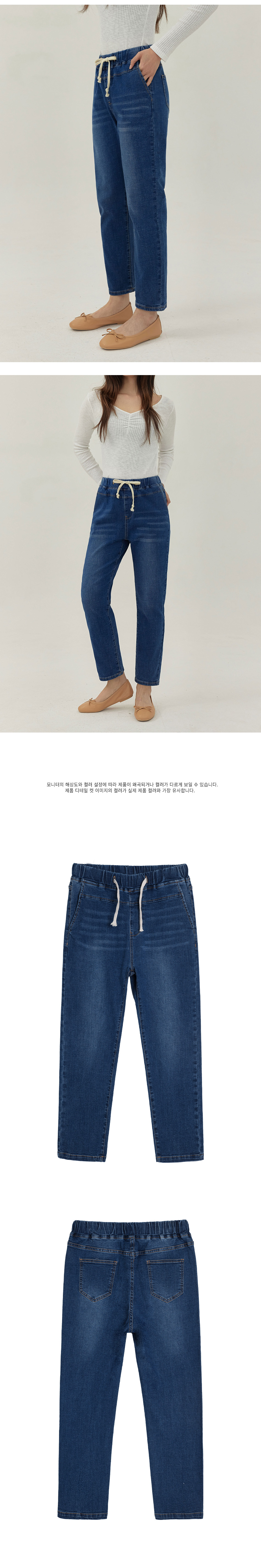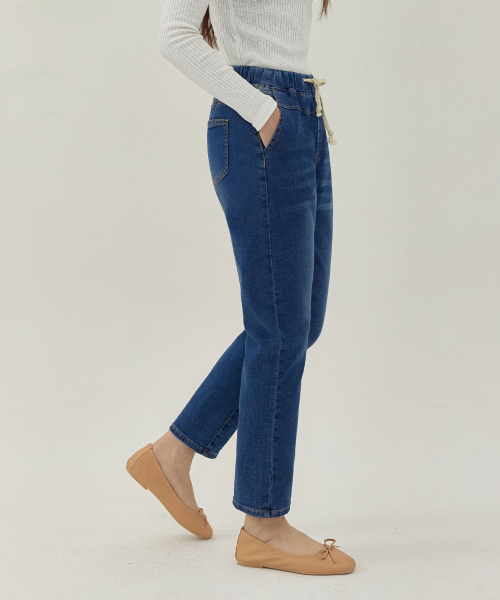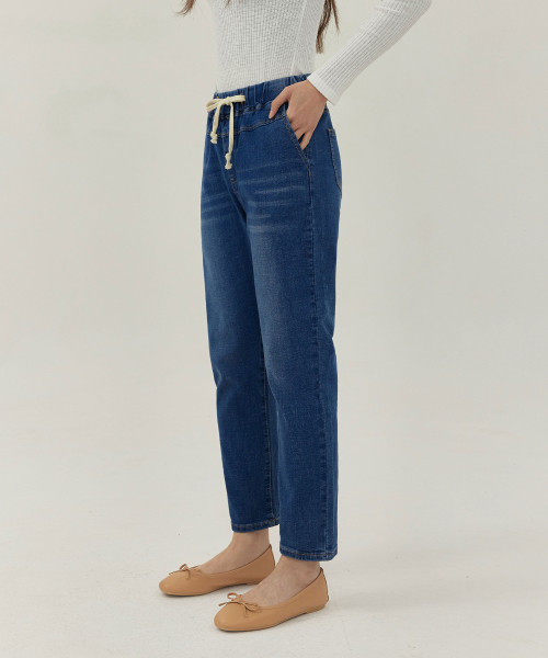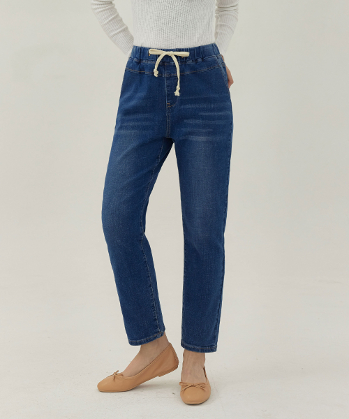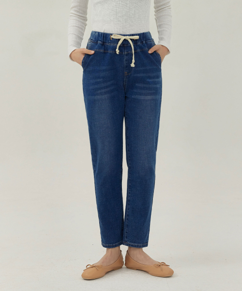 여성 워싱 허리스트링 배기핏 맘핏 데님 팬츠 (블루)