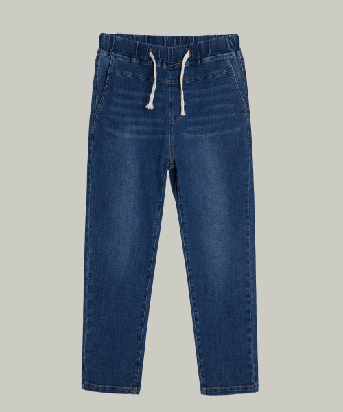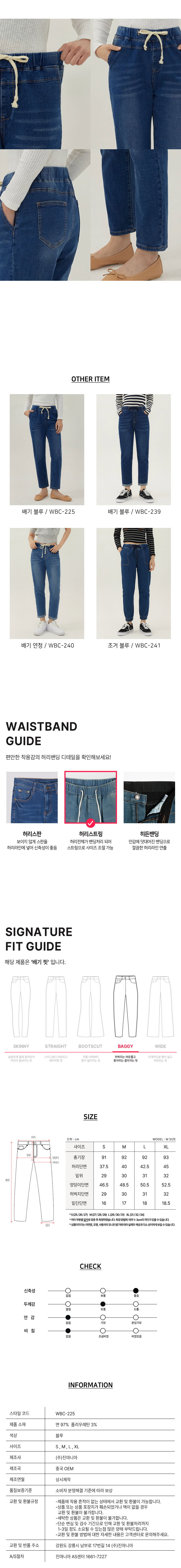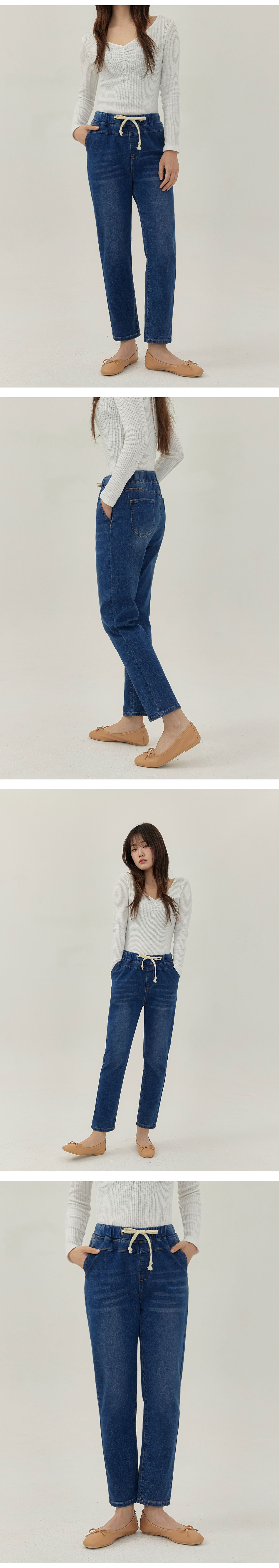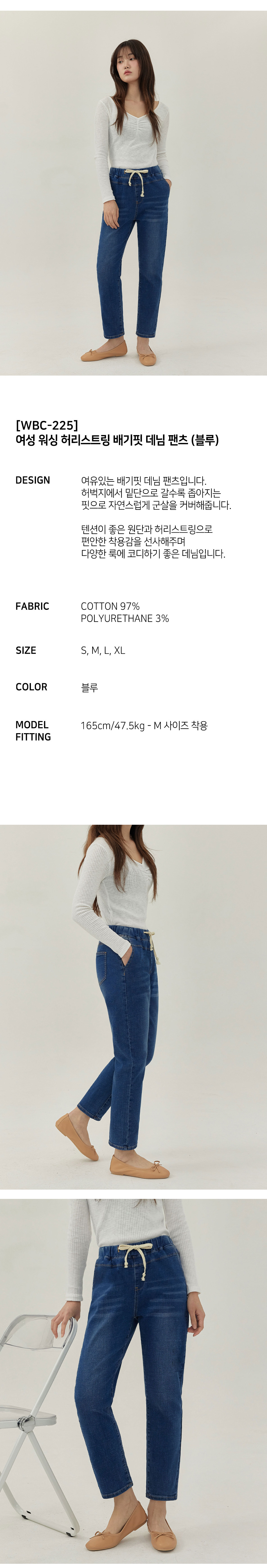 여성 워싱 허리스트링 배기핏 맘핏 데님 팬츠 (블루)
