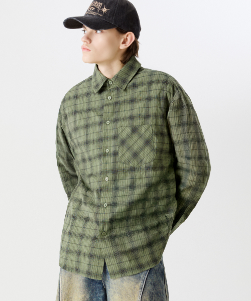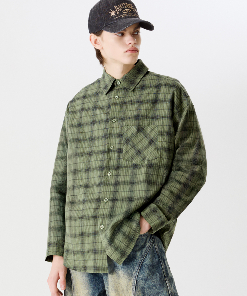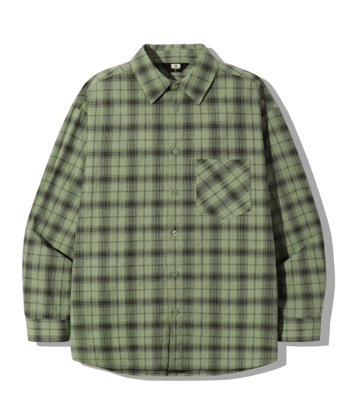 원 포켓 오버핏 플레이드 체크 셔츠 [카키]