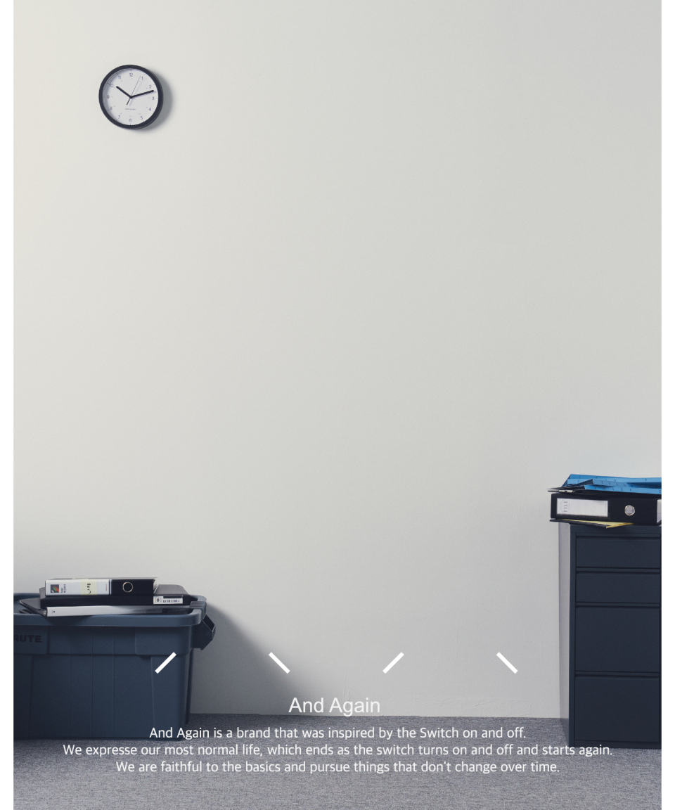 앤드어게인(ANDAGAIN)은 스위치의 온오프에서 영감을 받아 시작한 브랜드입니다. 스위치가 켜지고 꺼짐에 따라 끝내고 다시 시작하는 가장 보통의 인생을 표현합니다. 가장 기본에 충실하고 시간이 지나도 변하지 않는 것들을 추구합니다.