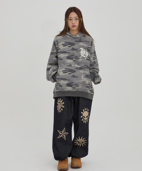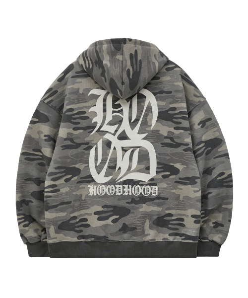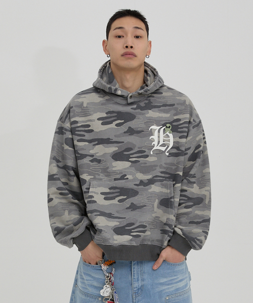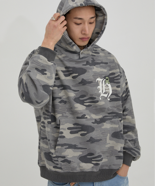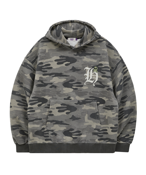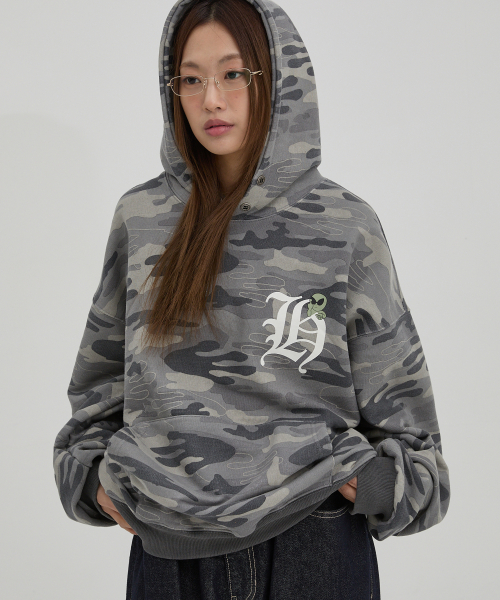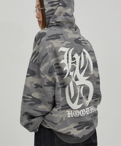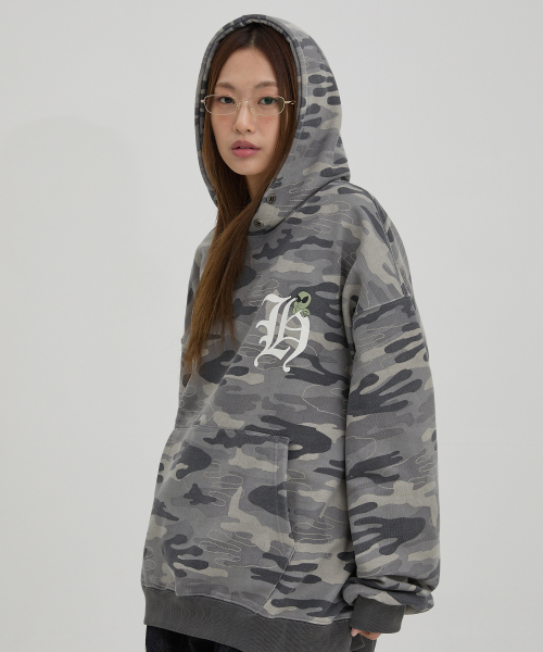 H 로고 에일리언 오버핏 후드 카모
