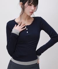 레이어드 헨리넥 슬림 롱슬리브 탑_네이비