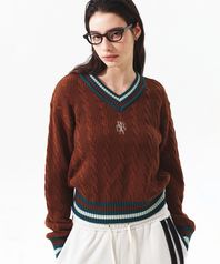 CABLE V NECK LONG SLEEVE KNIT BROWN