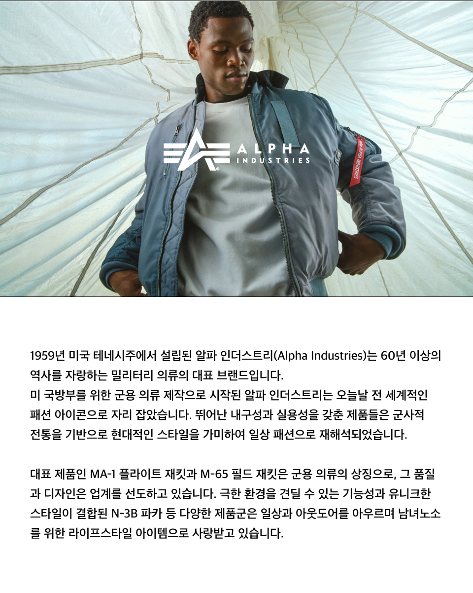 알파 인더스트리(ALPHA INDUSTRIES)는 1959년 테네시주 녹스빌의 한 공장에서 시작한 브랜드입니다. 미국의 육·해·공군 및 해병대원을 보호하는 플라이트 재킷이나 코트를 제공하는 공식 공급업체(오피셜 서플라이어)로 엄격한 밀스펙(군대에서 정해 놓은 기준)을 엄수하며 생산합니다. 특히 알파 인더스트리는 다른 업체와 달리 군수품과 일반인에게 판매되는 재킷에 등급의 차이가 없습니다. 알파 인더스트리의 제품은 미국은 물론 전 세계 각지의 미군 기지에서 활동하는 군인이나 파일럿, 지상 요원이 입는 재킷과 같은 그레이드의 아이템입니다.