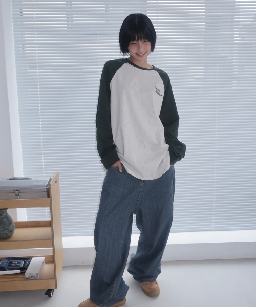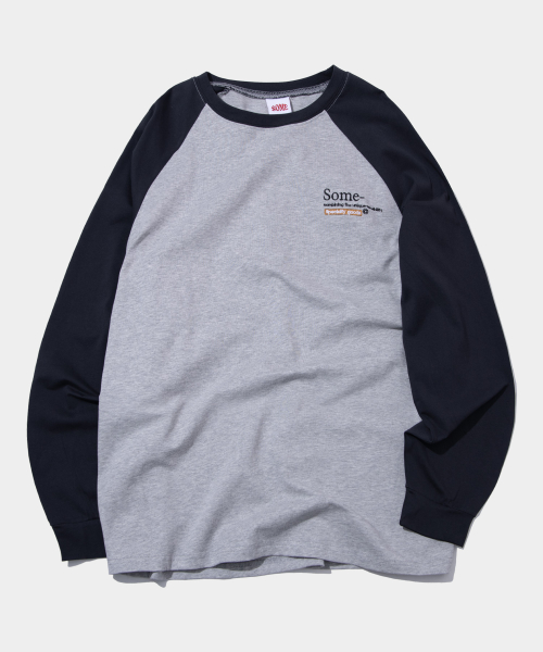 로고 커브드 라인 래글런 배색 롱슬리브 오버핏 티셔츠[네이비]