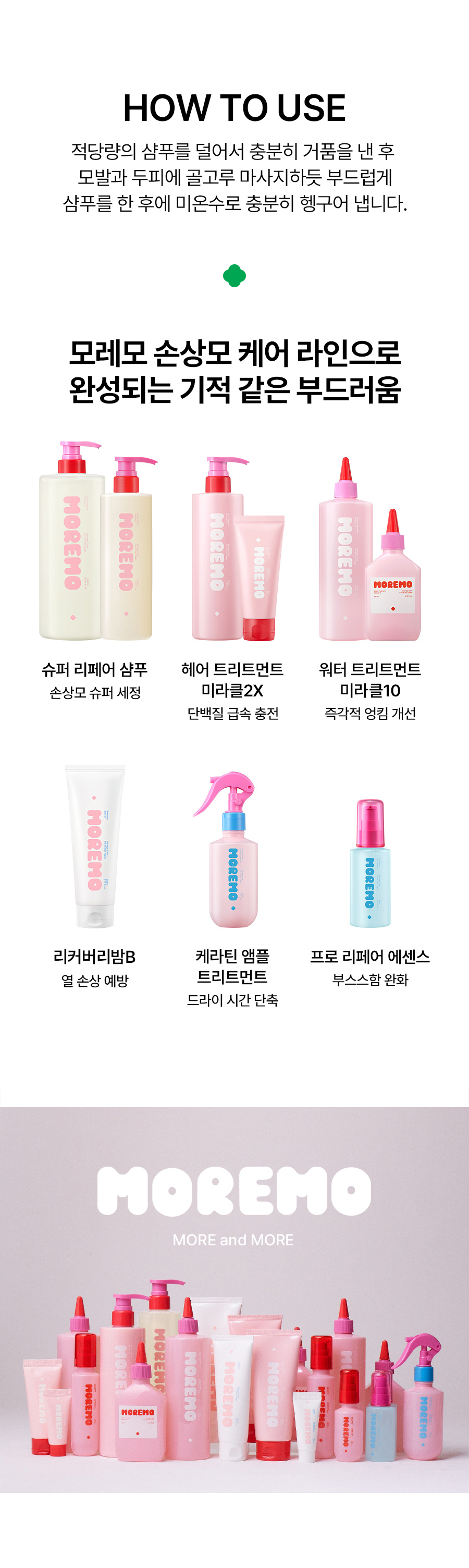 모레모(MOREMO)는 건강하고 아름다운 헤어 라이프를 위해 끊임없이 연구하고 노력하는 연구소 기반의 정통 헤어케어 브랜드입니다.
