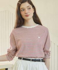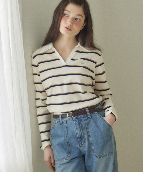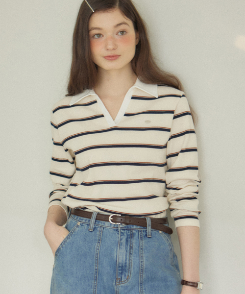 스트라이프 오픈 카라 롱 슬리브 티셔츠 - 아이보리
