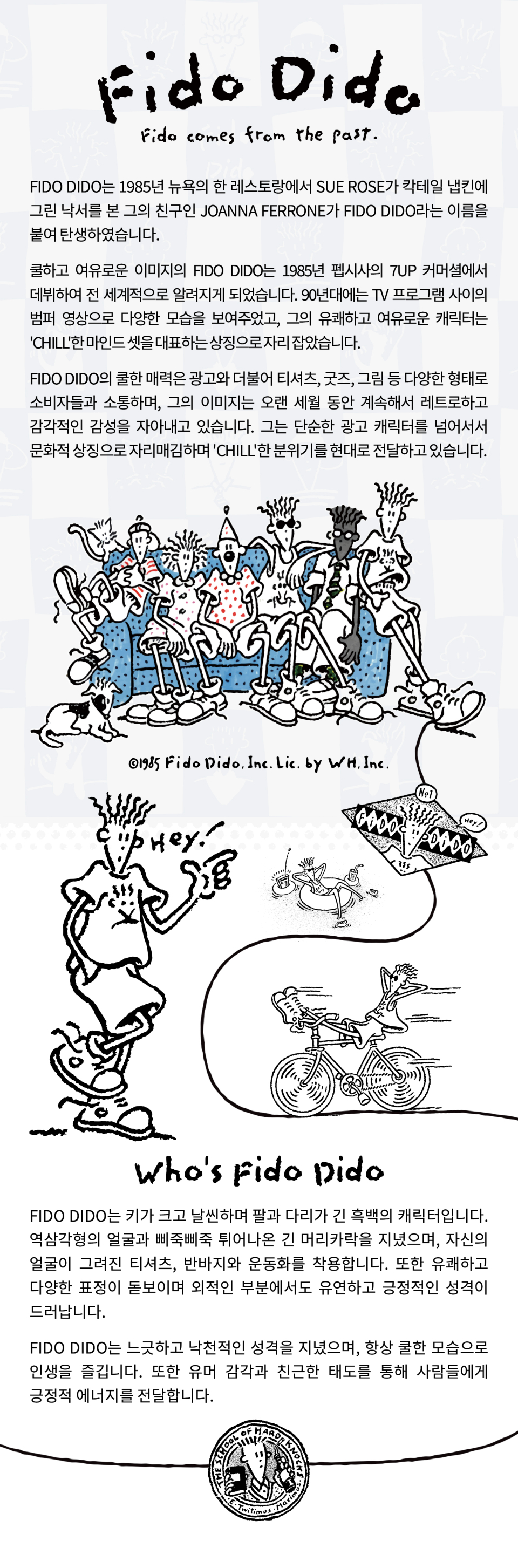 피도디도(FIDO DIDO)는 1985년 뉴욕의 레스토랑에서 SUE ROSE가 칵테일 냅킨에 그린 낙서를 본 친구 JOANNA FERRONE가 이름을 붙여 탄생한 브랜드입니다. 쿨하고 여유로운 이미지로 1988년 펩시의 7UP 커머셜에서 데뷔하여 전 세계적으로 알려지게 되었습니다. 90년대에는 TV 프로그램 사이의 범퍼 영상으로 다양한 모습을 보여주었고, 유쾌하고 여유로운 캐릭터는 'chill'한 마인드 셋을 대표하는 상징으로 자리 잡았습니다.