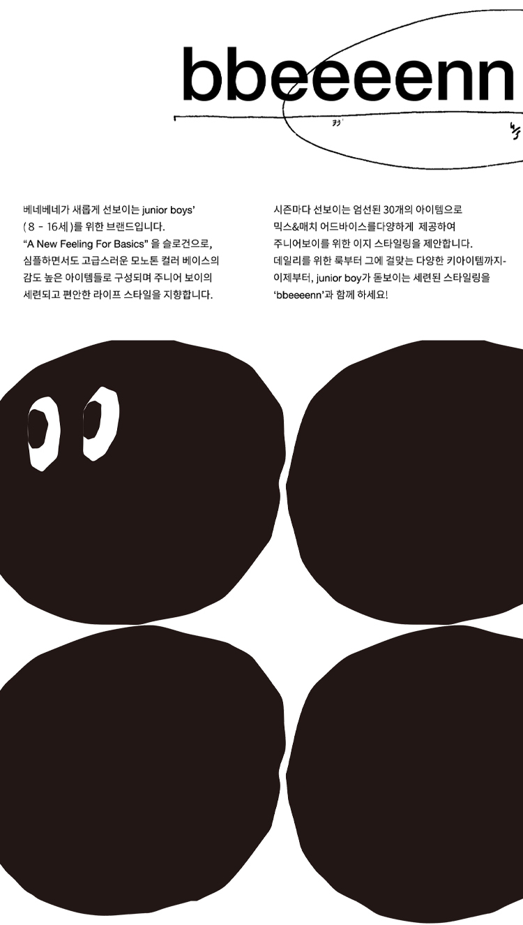 벤(BBEEEENN)은 주니어들의 편안하면서도 세련된 라이프스타일을 지향합니다. 매 시즌, 엄선한 30개의 심플하면서도 고급스러운 모노 톤 컬러 베이스의 아이템을 선보입니다.
