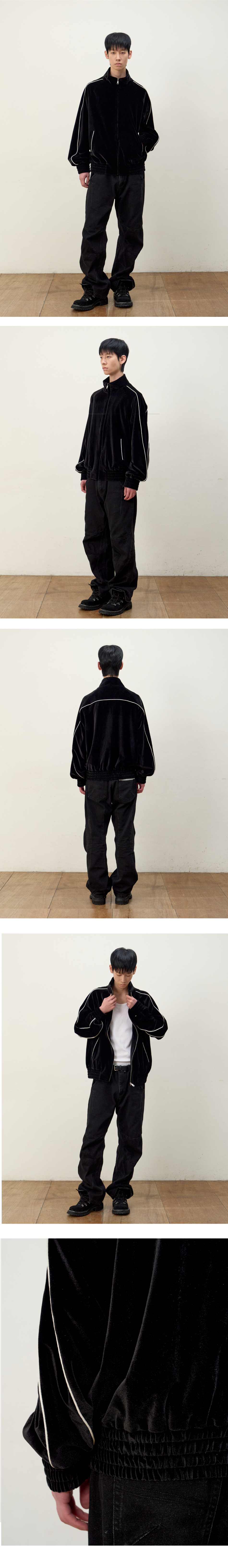 곁감 : POLYESTER 93% POLYURETHANE 7% 안감 : POLYESTER 100% 세미 오버핏의 트랙자켓 소매, 밑단 밴딩 파이핑 디테일 사이드 포켓