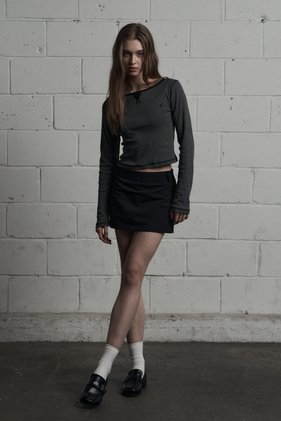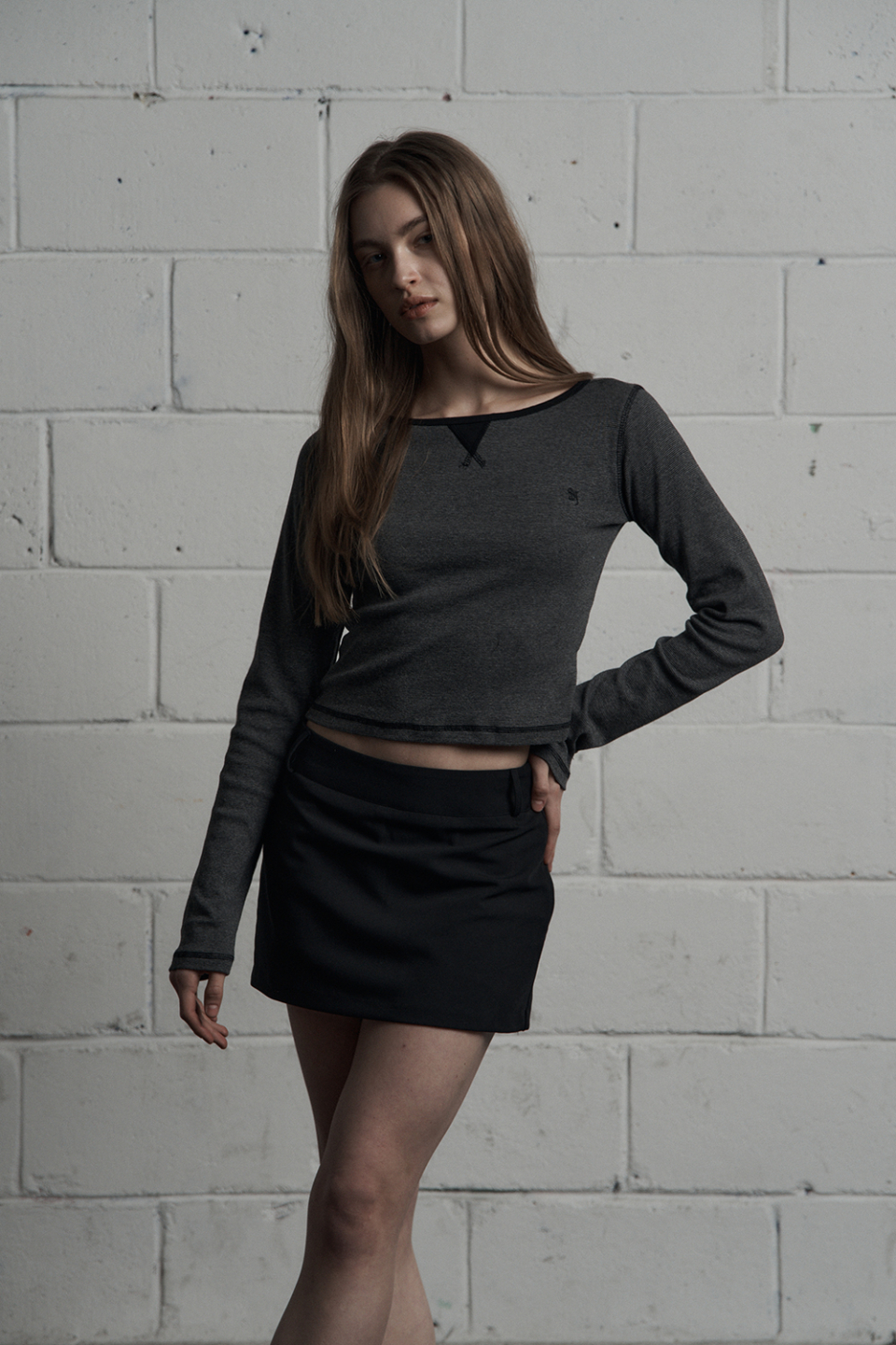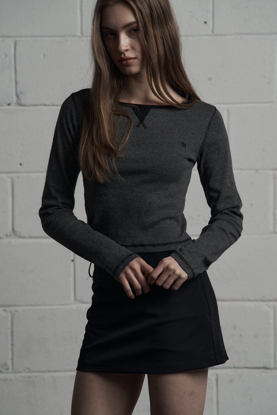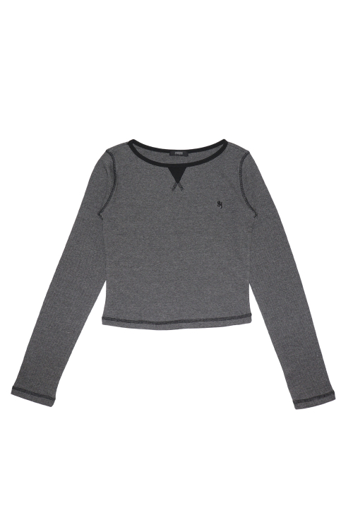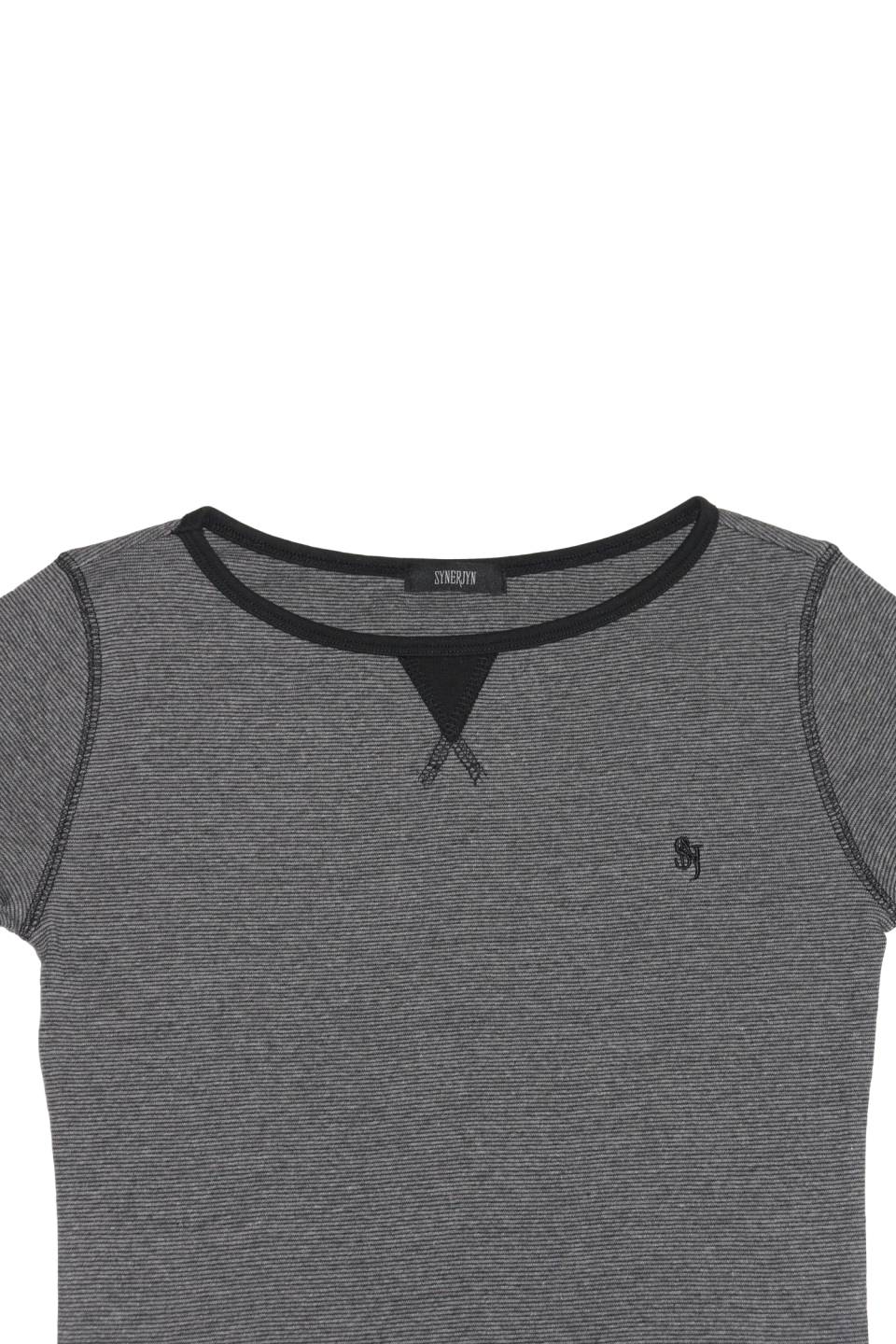 - 스트라이프 패턴에 스티치와 트라이앵글 배색 포인트를 준 보트넥 긴팔 티셔츠