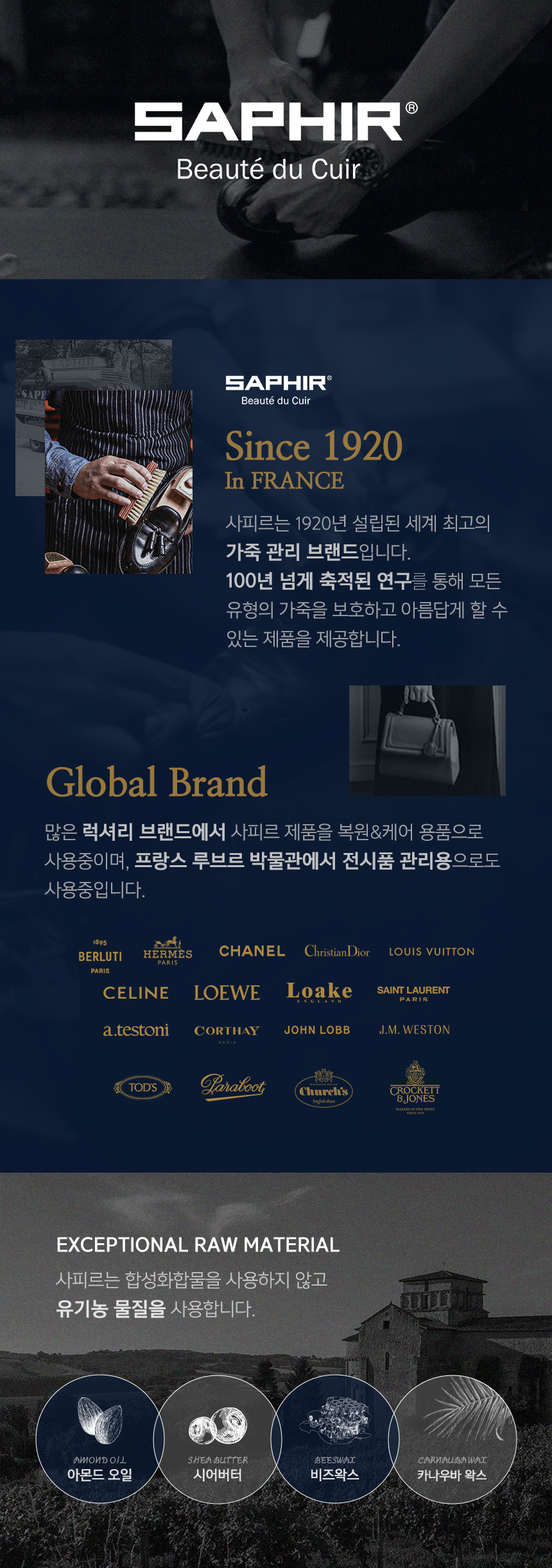 SAPHIR(사피르)는 1920년 프랑스 파리에서 설립된 프랑스를 대표하는 가죽케어 브랜드입니다. 꾸준한 연구와 최고의 재료의 결과로 가죽의 보존과 관리, 품질과 다양성으로 세계 여러나라로 수출하고 있습니다. 1925년 가죽제품의 장인정신을 오래 즐길 수 있도록 본래의 특성을 살린 케어제품 프리미엄라인을 출시하여 더욱 완벽한 제품을 선보이고 있습니다.