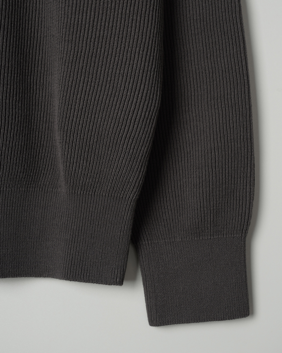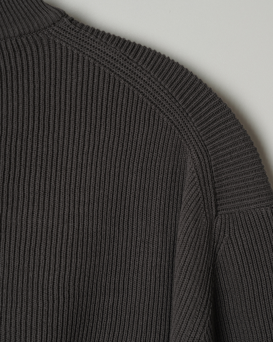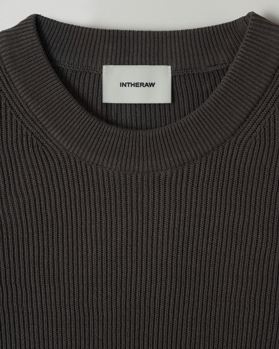 촘촘하게 이중으로 짜여진 RIB조직은 편직의 난이도와 시간이 일반적인 니트 조직에 비해 2배 가량의 시간과 원사량을 필요로 하는 고난이도의 작업이며 텍스쳐의 질감이 돋보이는 것이 특징입니다.