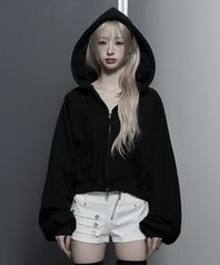Hotfix Detail Cropped Two-Way Zip Hoodie (Black)