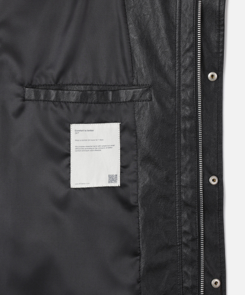 스탠드 칼라와 힙을 살짝 덮는 기장감 등 클래식 필드 자켓의 원형을 현대적으로 재해석했습니다. 사용된 신세틱 레더는 특수 코팅 과정을 거쳐 실제 가죽과 흡사한 질감을 선사하면서도 오염과 습기에 강해 실용적입니다.