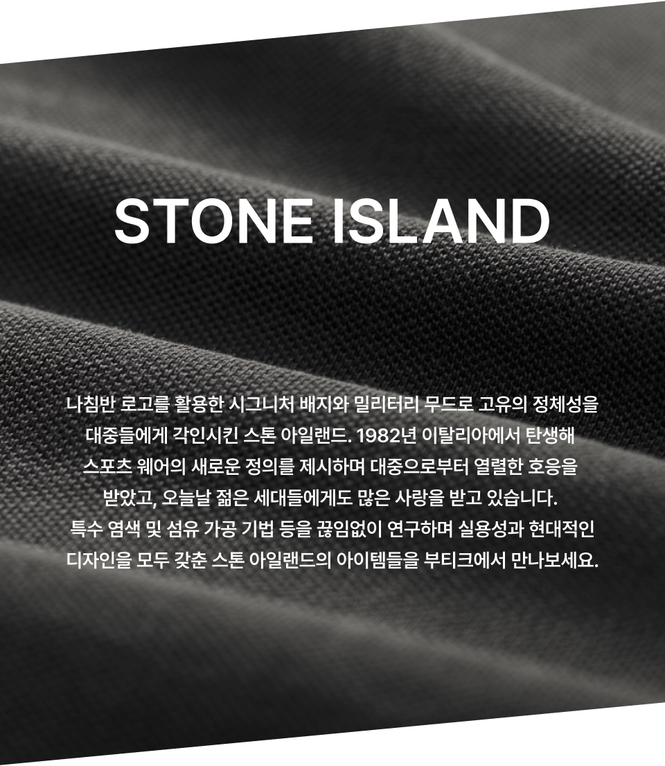 STONE ISLAND(스톤아일랜드)는 실험적인 염색의 인쇄 시설이 기술을 통해 독특한 colorings(하나의 의류에 6색)과 마감을 달성하기 위해 고품질의 의류 염색의 가능성 내에서 많은 연구를 기획하고있는 브랜드입니다. 군복과 작업복에서 영감을 얻어 4만종의 의상을 생산하고 있으며, 스포츠 회사 고유의 실험과 최첨단 마모디자인으로 전세계에서 인정을 받고 있는 브랜드입니다.