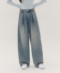 인버티드 핀턱 벌룬핏 와이드 데님 팬츠 유니섹스 (연청)