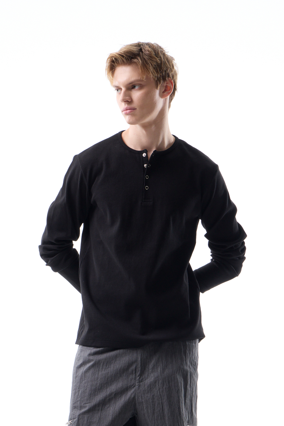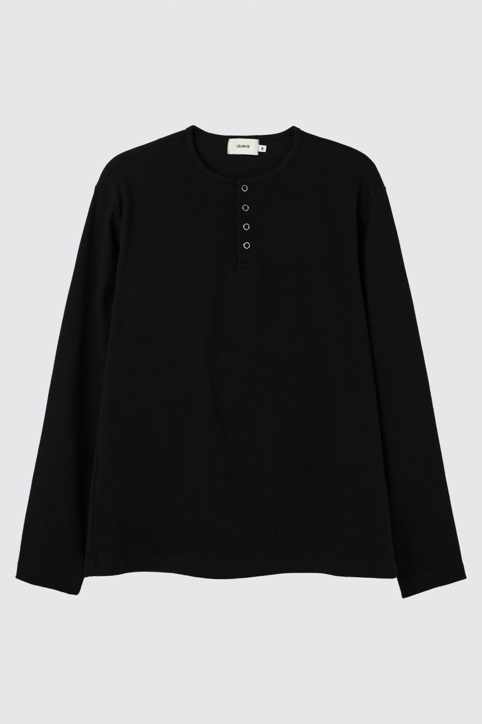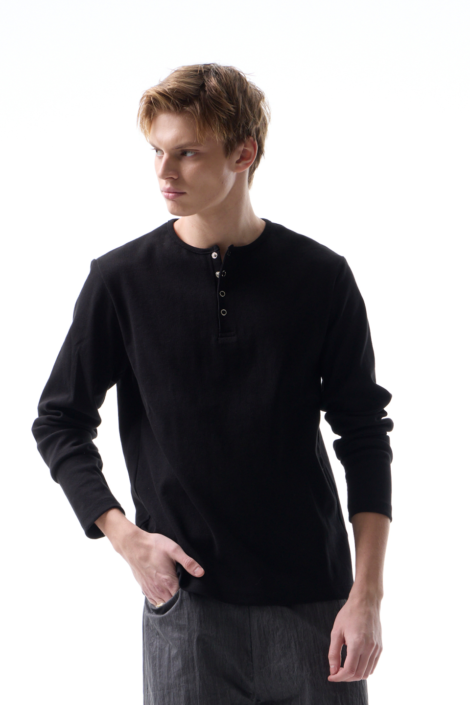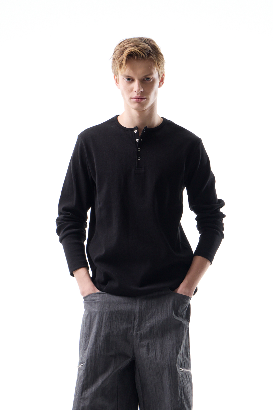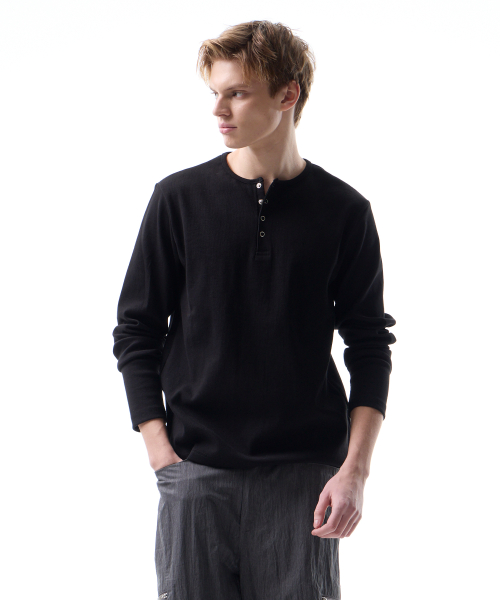 부드러운 텍스처와 견고한 골지 짜임의 헨리넥 티셔츠