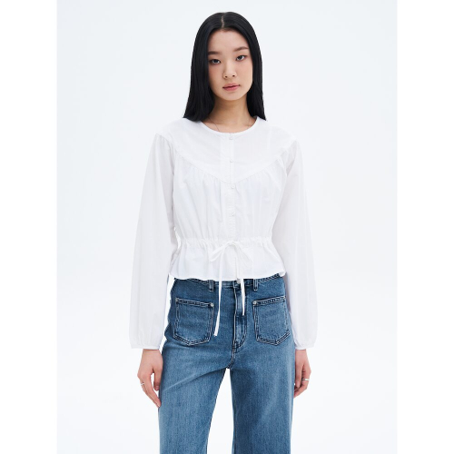 가벼운 코튼 소재로 제작된 긴소매 블라우스입니다. 허리에 셔링을 잡을 수 있는 끈이 있어 체형에 맞게 착용할 수 있으며, 귀여운 무드를 배가합니다. 긴 소매로 제작돼 간절기 이너로 활용하기 좋은 아이템입니다.