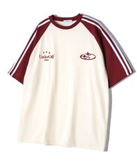 오버핏 래글런 트랙 라인 반팔 티셔츠 스타로고 버건디